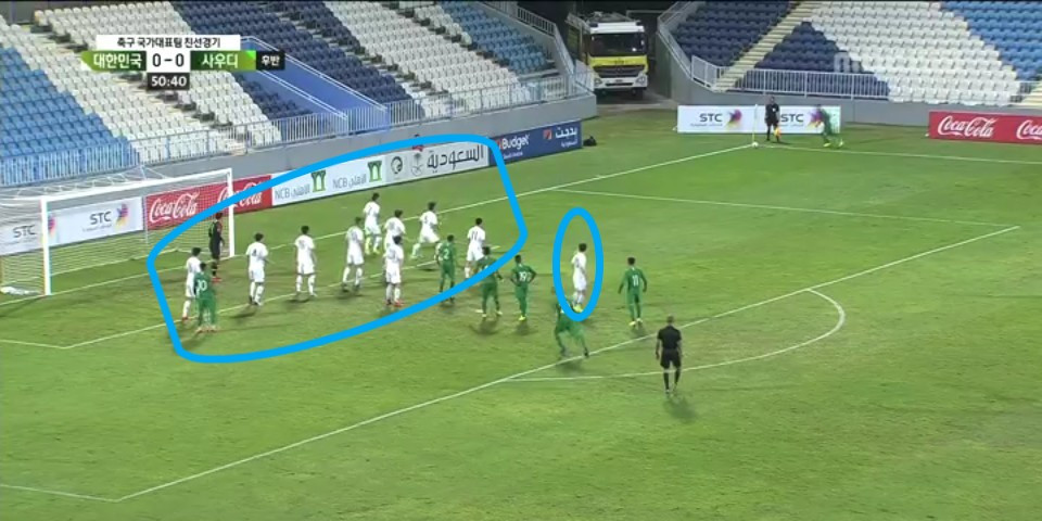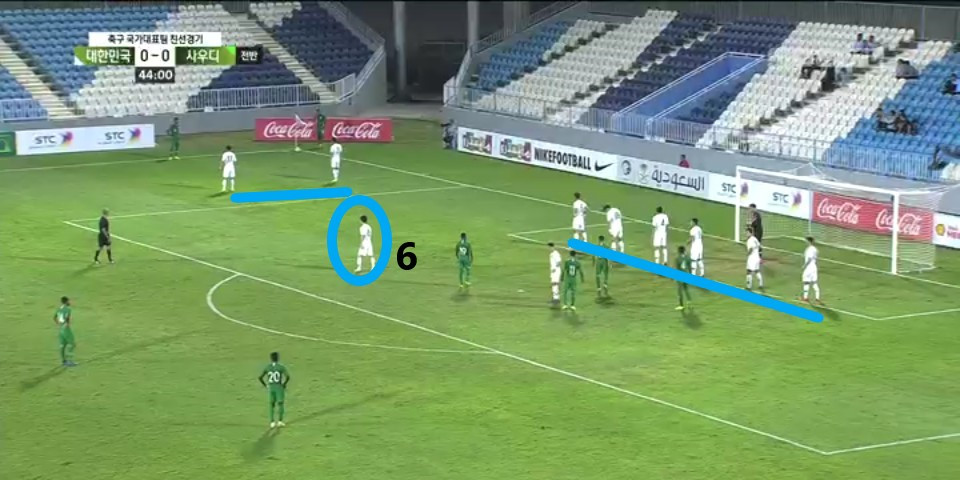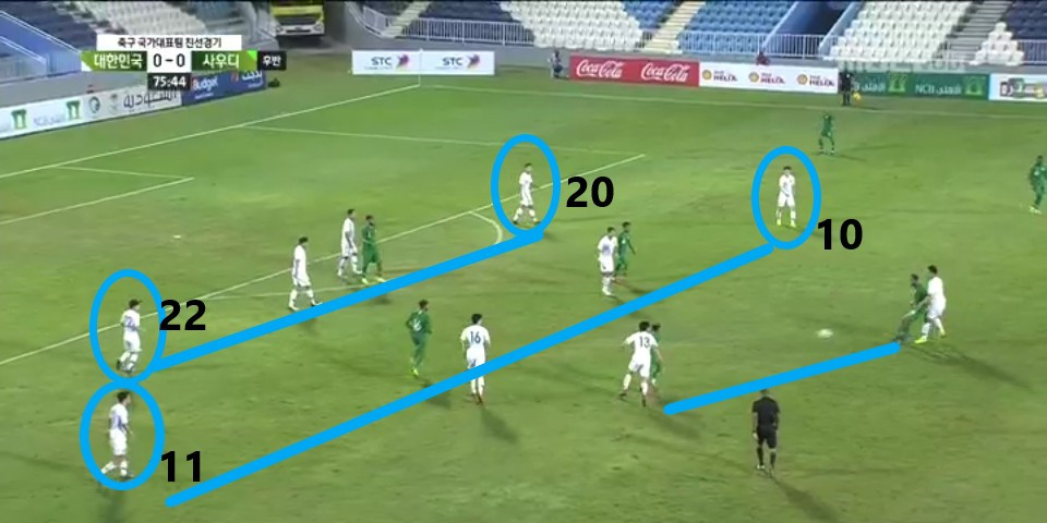 - 골킥 시 최후방 수비수인 '김민재'(4번)와 '김영권'(19번)이 GK(골키퍼)와 같은 라인에 위치하고 '정우영'(5번)은 중앙 빈 공간으로 들어와 볼 받은 준비를 함. 이 경기에서 '권경원'(20번)은 전반전에 측면을 활용하는 플레이를 보여주었기에 이 상황에서도 측면에 배치되어 공격을 대기함.