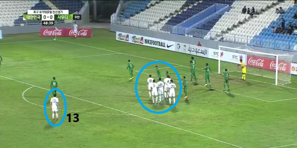 - 코너킥(Coner kick)상황 시 상대 GK와 먼 위치에 선수들이 밀집해 있음. 이 장면에서는 선수들이 퍼지면서 상대 골문을 위협하였지만 다른 전술(밀집한 상태로 이동함 등)도 사용할 수 있는 상황임. 또한, '구자철'(13번)은 PK(페널티)지역에서 나오는 세컨드 볼(Second ball)을 준비함.