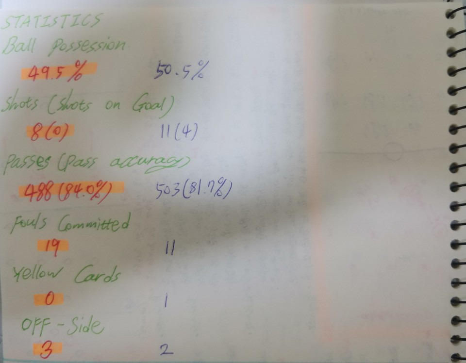 - 전반전에는 상대에게 점유율을 내주면서 고전하였지만 후반전에는 공격적으로 상대를 위협하는 플레이를 보임. 전체적으로 점유율(49.5%)에서는 밀렸으나 실리축구를 보여줌. 8회의 슈팅 중 유효슈팅 0회는 많이 아쉬운 부분임. 하지만, 3회의 오프사이드를 기록하였다는 것을 토대로 상대 수비와 동일 선상에서 플레이하며 수비수에게 부담을 주는 공격 플레이를 보여주었다고 볼 수 있음.