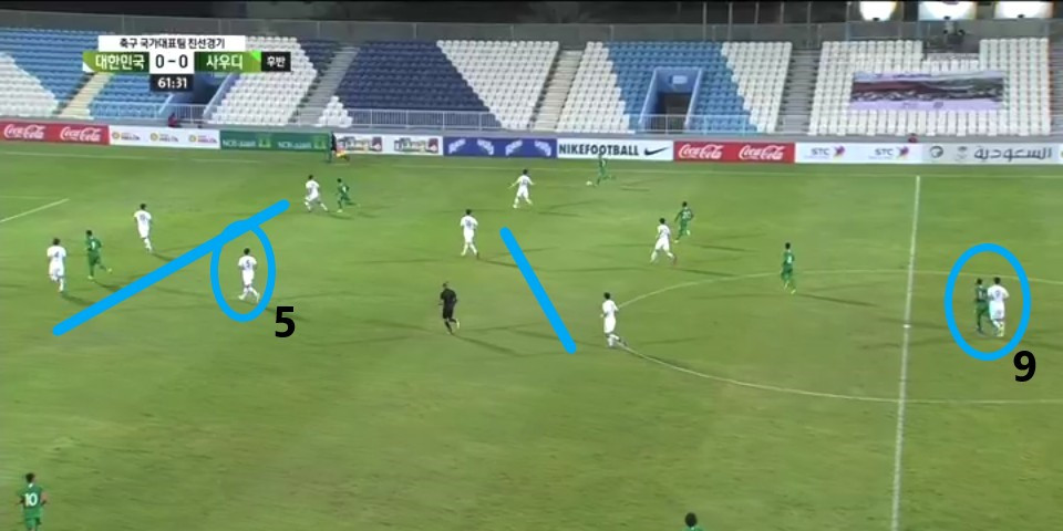 - 상대가 형성한 수비라인에 유인되어 부정확한 패싱(Passing)으로 공격 작업이 끝났던 상황임. '황인범'(6번)이 볼을 받기 위해 움직일 때 '황인범'의 마크맨(Markman)을 포함하여 주변에 있던 동료 수비수 2명이 함께 순간적인 압박 플레이를 펼치며 볼을 차단당함.