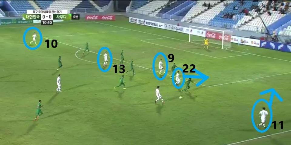 - 공격 진행 시 '이용'(2번)이 우측 높은 공간에서 볼을 배급할 때 '이청용'(17번)이 상대 마크맨(Mark man)을 달고 측면으로 이동하고 '황희찬'(11번)이 상대 최종 수비수와 함께 골문 앞쪽으로 이동하면서 발생한 공간을 '황의조'(18번)와 '기성용'(16번)이 위치하며 상대에게 위협적인 공격을 가함.