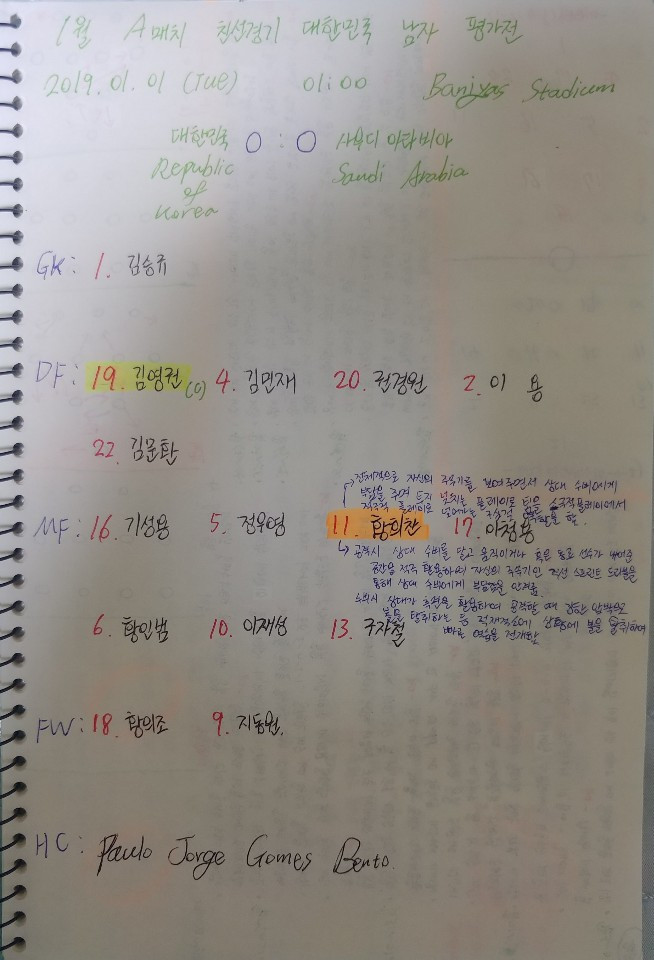 2019년 01월 01일 화요일 01:00(한국시간) 아랍에미레이트(UAE) 아부다비(Abu Dhabi)의 바니야스 스타디움(Baniyas Stadium)에서 대한민국과 사우디아라비아의 2019 AFC아시안컵 대비 마지막 평가전이 열렸다.