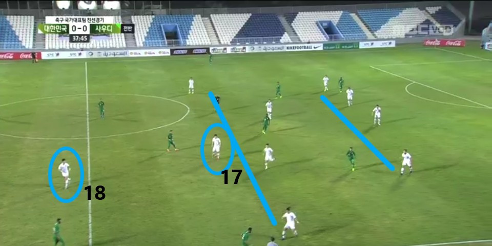 - '황의조'(18번)가 상대 최후방 수비 라인과 동일 선상에서 활동하며 수비를 교란시킴과 동시에 '황희찬'(11번)이 수비 선수 사이에 발생한 공간을 파고듦. 또한, 상대 DF와 MF라인 사이에 발생한 공간을 '권경원'(20번)과 '구자철'(13번)이 돌파하며 상대 가 쉽게 수비하지 못하도록 함.