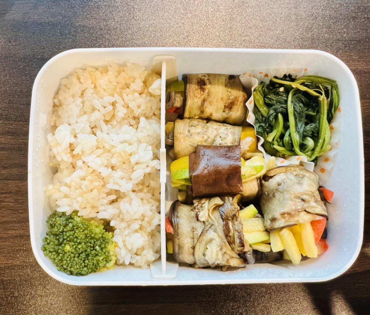 야채들과 구운 가지로 말아서 놓고 시금치 무침의 나물을 곁들인 인내의 도시락