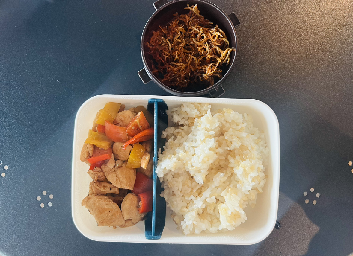 닭안심을 구운다음 파프리카와 함께 굴소스를 조금 넣고 소금으로 간을 한 후 볶기 시작한다. 단백질과 더불어 탄수화물을 위해 현미밥으로 밥을 지었다. 이미 닭안심을 볶을 때 굴소스가 들어간 순간 다이어트가 아니게 되었지만 미리 만들어놓은 고추장 멸치볶음을 반찬으로 곁들이니 더욱이 다이어트 도시락이 아닌 입맛이 당기는 도시락이 되었다.