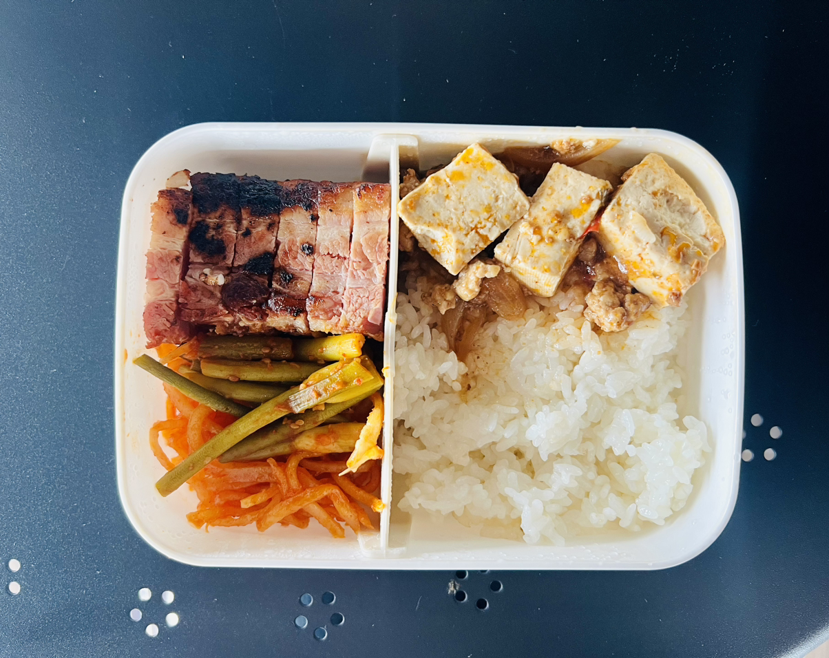 열심히 시장 안을 누비면서 찾던 다진 돼지고기는 이렇게 가까운 정육점에서 만들어달라고만 외치면 되는 간단한 고기였다는 것에 충격을 먹었다. 한편으로 허탈도 했다. 몰랐으면 진작에 물어보면 될 것 가지고 그게 뭐가 부끄러워 안 물어봤을까 하는... 그렇게 삶의 지혜와 소소한 생활의 지혜를 터득하여 만든 다진 돼지고기두부조림의 탄생은 도시락에 고스란히 녹아졌다.