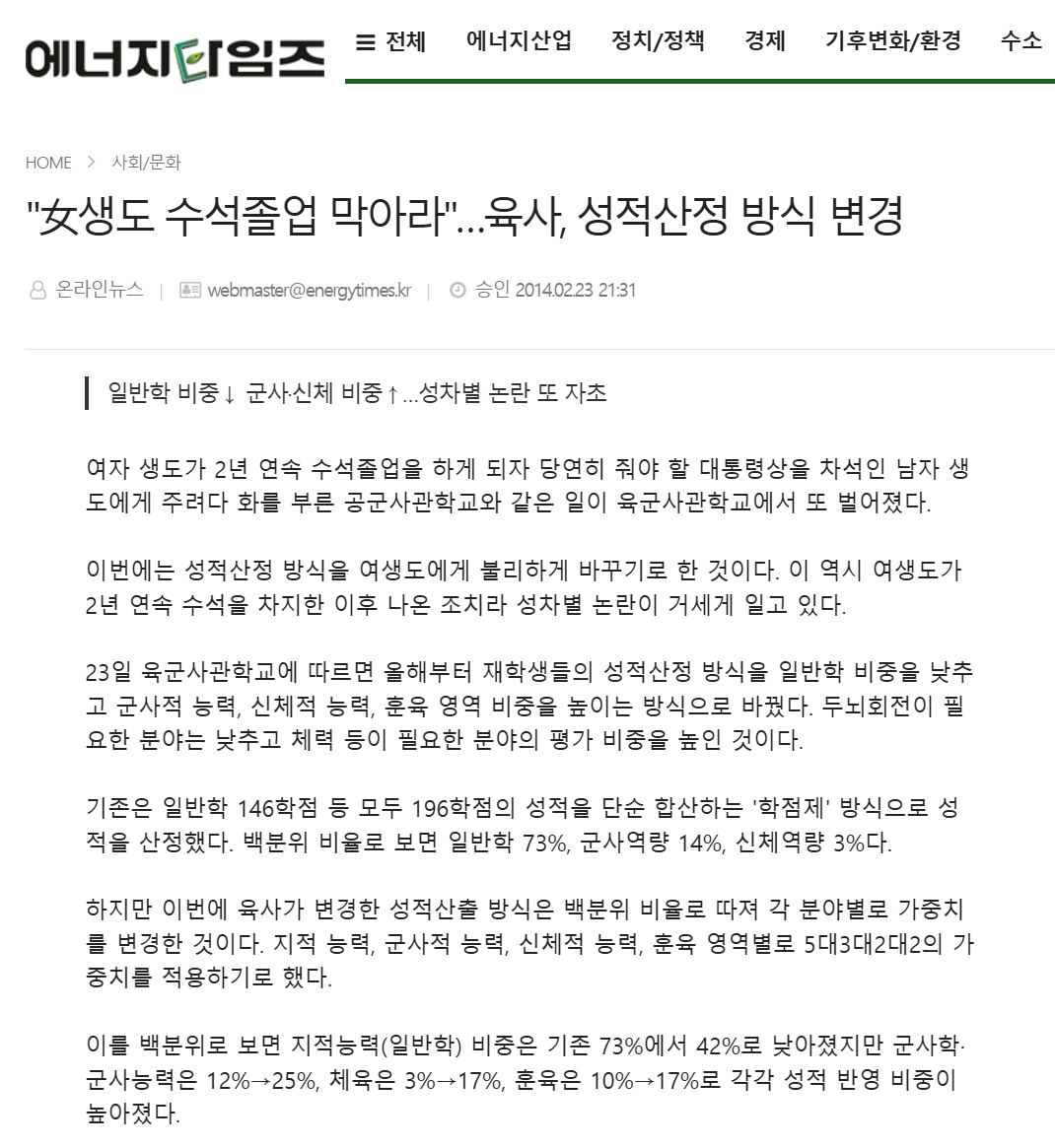 육군사관학교의 수석 졸업생에 대한 통계는 남성 우위 신화에 시사점이 크다. 2012년에는 여성으로서는 첫 육사 수석 졸업생이 나왔고, 이듬해 수석 졸업생도 여성이었다. 남성 우위의 군대 조직 입장에서는 자존심이 상하는 일이었을 것이다. 육사 졸업생은 졸업 등수에 따라 ~001, ~002 순으로 군번을 받게 되는데 1번 군번을 여성에게 주고 싶지 않았다(는 의심은 당연하다). 육사는 2014년부터 성적산출 방식을 바꾼다. 지적능력(일반학) 비중은 기존 73%에서 42%로 낮아졌고, 군사학·군사능력은 12%→25%, 체육은 3%→17%, 훈육은 10%→17%로 각각 성적 반영 비중이 높아졌다. 그 후 몇 년 간은 수석 졸업이 남생도에게 돌아갔지만, 2017년부터 2020년까지 4년 연속으로 수석 졸업생은 다시 여성이 차지하였다.