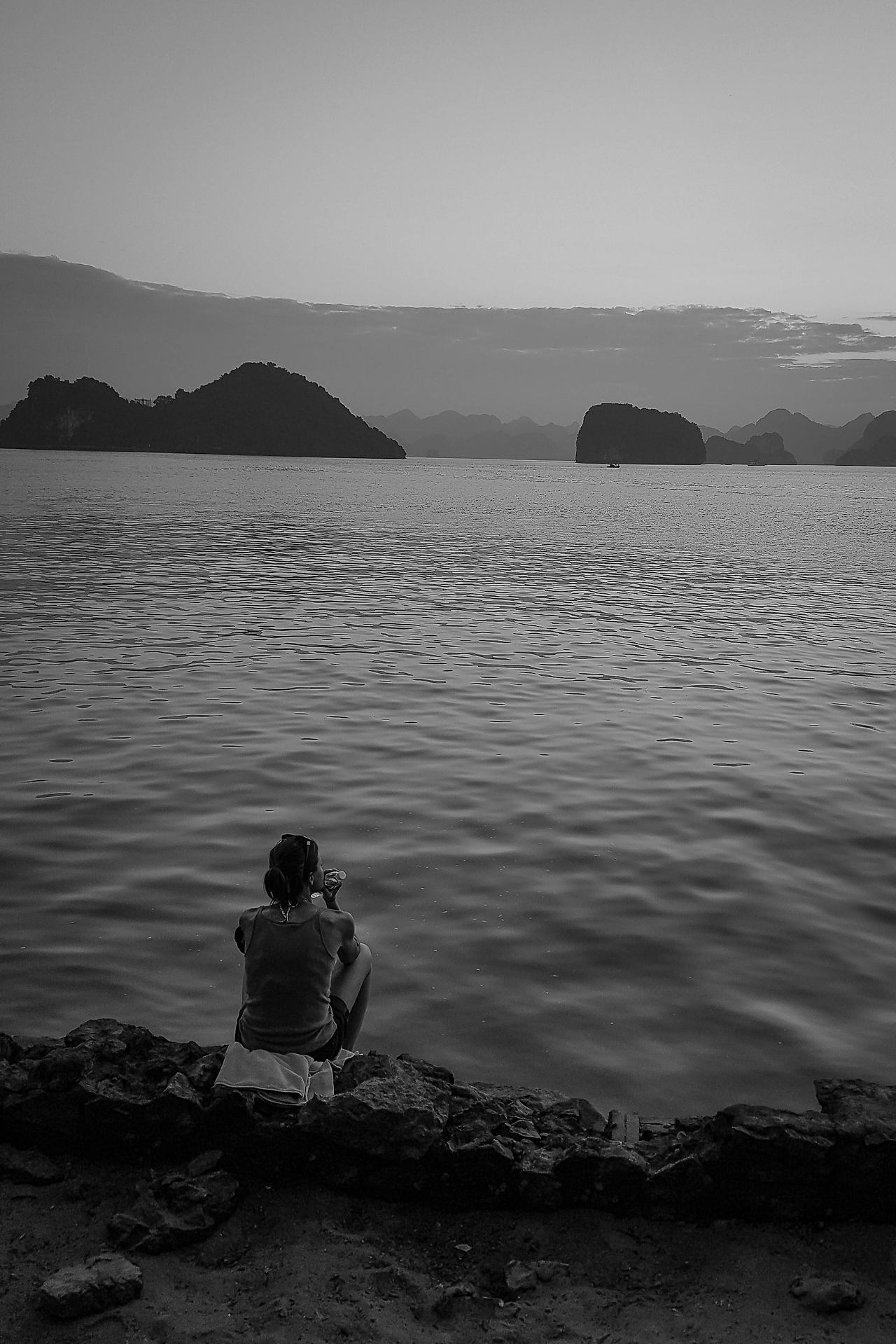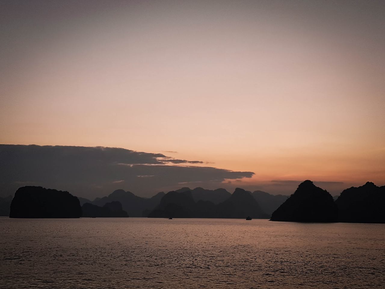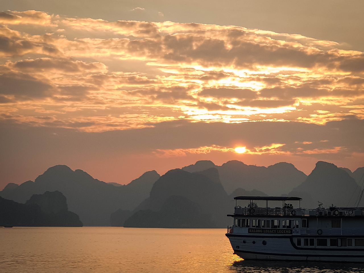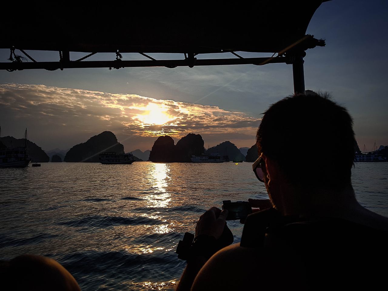 그렇게 반 정도 되는 사람들이 배를 옮겨 타고 몇몇은 떨어지는 석양을 보고, 몇몇은 잠시의 시간 동안 해수욕을 하기도 한다. 하롱베이의 석양은 참 남달랐다. 섬과 섬 사이 그 섬의 능선으로 떨어지는 해가 주는 묘한 감정이 말이다. 하염없이 떨어지는 해를 보면 다들 무슨 생각을 하고 있을까? 집에 두고 온 강아지 생각? 아니면 흔쾌히 여행을 떠나라 하고 열심히 일하고 있는 옆지기들? 그것도 아니면 여행을 마치고 집으로 돌아가 상환해야 할 대출이자? 그렇듯 모든 이들이 바라보는 석양 속엔 그들의 세상의 생각을 녹여내는 것이 아닐는지..