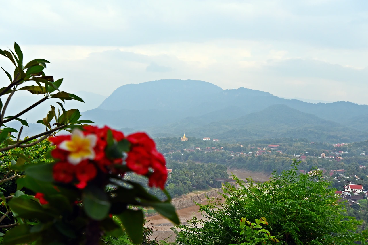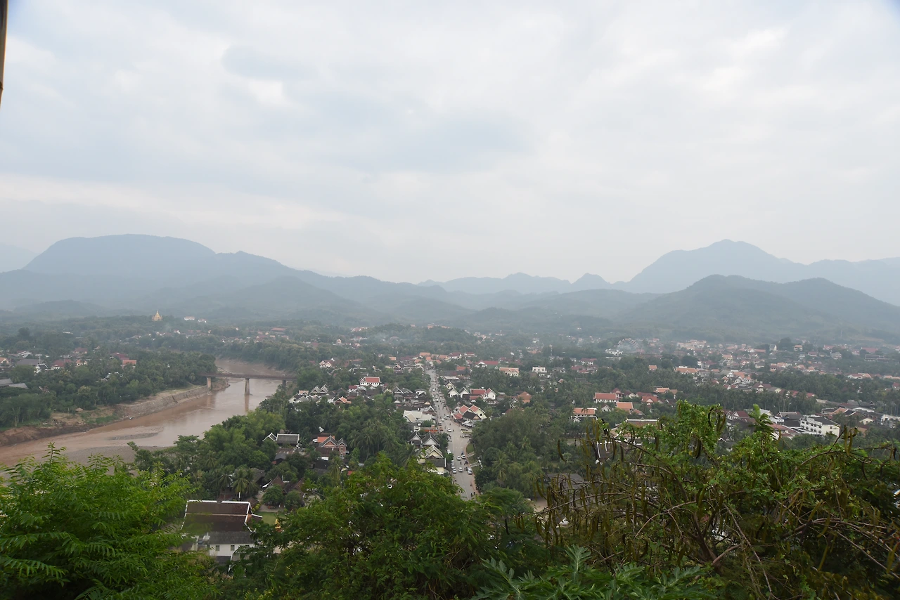 중간쯤 가니 원래 안 좋은 왼쪽 도가니가 찌릿하다. 어쩌겠는가 올라야지 오늘의 메인이벤트인 석양을 맞이 하기 위한 약간의 고통은 받아들여야 하는 것 아닌가? 하지만 아프긴 하다. 그렇게 오른 푸시산에서 바라보는 루앙프라방의 전경은 기가 막히게 좋더라. 동서남북으로 막힌 것이 없어 놓으니 시야감이 탁월하다.