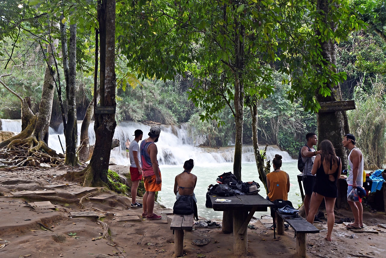 오늘의 마지막 하이라이트라고 해도 과언이 아닌 꽝시폭포에 도착을 하고, 다들 개인적으로 얕은 언덕을 오르기 시작한다. 조그맣게 들리는 물소리에 귀를 기울이면서 오르다 보니 점점 물줄기가 커져 간다.
