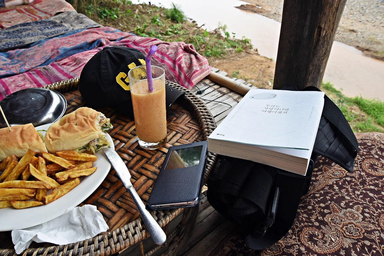 그렇게 강가 자리에 널부러 지듯 짐을 내려놓는다. 아침은 먹었지만 셰이크와 샌드위치를 시키고는 책은 한 자락 읽어 나가는 시간, 옆 자리 멕시코에서 온 부부는 들어오자마자 눕는다. 잠시 후, 코 고는 소리가 들릴 정도로 숙면을 취하는 모습에 이곳이 레스토랑이 맞는 건가... 하는 의구심이 들 정도.