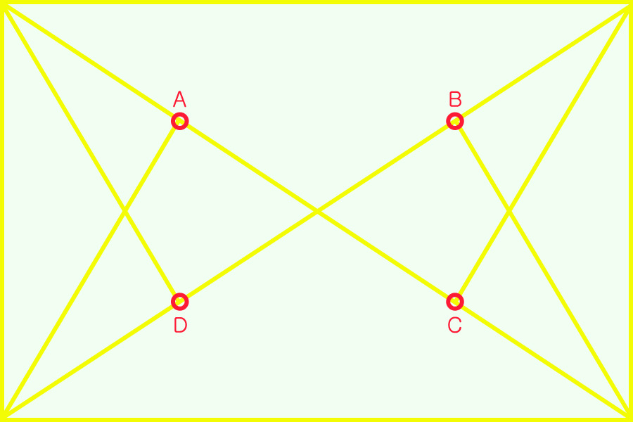 그 방법은 3 분할 법칙의 것과 같다. 임의의 수평, 수직의 선을 긋고 (그림의 A, B, C, D 포인트가 수평, 수직선이 만나는 교차점) 그 선위에 대각으로 두 개의 선을 그어보자. 그리고 더불어 외곽의 각 꼭짓점에서 먼 쪽의 포인트를 향해 선을 또 그어보자. (상-좌의 포인트에서 D 포인트로 연결되는 선이 그 선이다.) 그러면 이 법칙을 지켜 담은 사진 한 장을 보자.