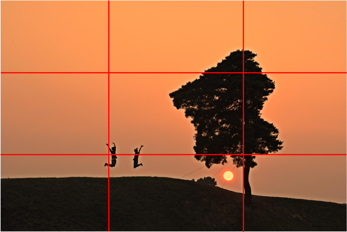 사진에서 가로로 3분의 1 지점과 3분의 2 지점, 세로로 3분의 1 지점과 3분의 2 지점에 가상의 선을 그었다고 생각을 하자. (여기서 잠깐, 현재 DSLR 및 모든 카메라는 가상의 임의선을 파인더에 노출시켜 기준점으로 사진을 촬영할 수 있으니 본인들의 매뉴얼을 참고하자)