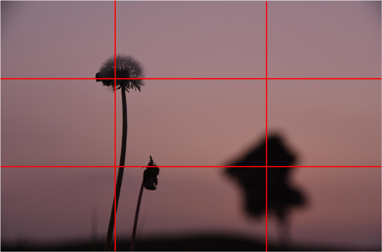 뷰파인더를 들여다볼 때 프레임으로 가로와 세로로 각각 3 등분하는 선들이 있어서 전체 프레임이 똑같은 크기의 아홉 개의 직사각형들로 분할되어 있다고 상상하며 담는 것이다. 3 분할 법칙을 사용하려면 피사체를 수직선과 수평선이 교차하는 "스위트 스포트" 가운데 하나에 (또는 두 개에) 배치하자. 피사체를 이 원칙에 따라서 배치한 구성을 볼 때 우리의 눈길은 보기에 좋거나 역동적이라고 느끼게 되어 하루방 사진과 같이 재미없고 정적인 사진이 되는 것을 막을 수 있는 방법이다. 같은 곳에서 담은 장면이지만 민들레 홀씨를 메인 피사체로 담은 장면을 하나 더 보자.