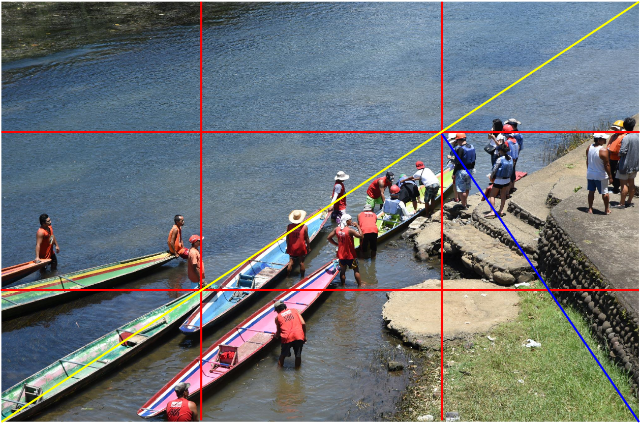 여기서 상기의 예시 그림과 같이 모든 대각의 라인을 적용할 필요는 없다. 그렇게 되면 오히려 사진이 방만해질뿐더러 어수선한 사진으로 되기 때문이다. 각 교차점에 피사체를 기본적으로 배치하였으며 좌-하 에서 상-우로 연결되는 대각선의 방향으로 (왜냐면 오른쪽 상부가 강의 상류이고 저 배들은 그곳으로 나아갈 것이기에 그러하다) 배들이 나열된 것을 볼 수 있다. 더불어 우-하의 포인트에서 B포인트로 연결되는 지점에 배에 올라타는 여행자들을 위치하고 왼쪽에 있는 대기 포터들의 시선 또한 B 포인트를 향해 있는 것을 볼 수 있다. 이렇듯 사진에 수평과 수직 그리고 대각선을 충분히 활용을 한다면 얼마든지 방향성과 액티브 한 사진을 담을 수 있는 것이다. 정적인 사진, 움직임이 없는 사진을 찍어야만 할 때도 있다. 그런 때를 제외하고 여행 및 풍경사진은 원체 정적이고 움직임이 없는 사진이기에 풍경을 담는 작가 자신이 풍경 속에서 움직임을 사진 속에 만들어 줘야 그 사진을 보는 이들의 시선이 정체되어 재미없게 만들지는 말아야 할 것이다.