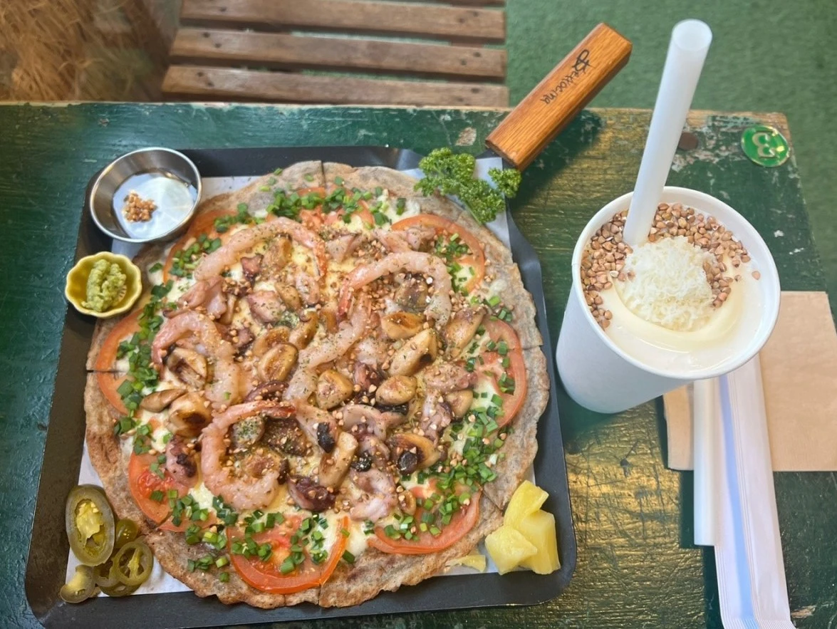눅눅한 메밀전을 바삭바삭하게 만들어 도우로 쓰고, 사람 키만 한 참문어에 동해 오징어와 새우 그리고 강원도 하면 빠질 수 없는 감자까지. 강원도에서 나고 자란 모든 특산물을 한데 모아놓았다.