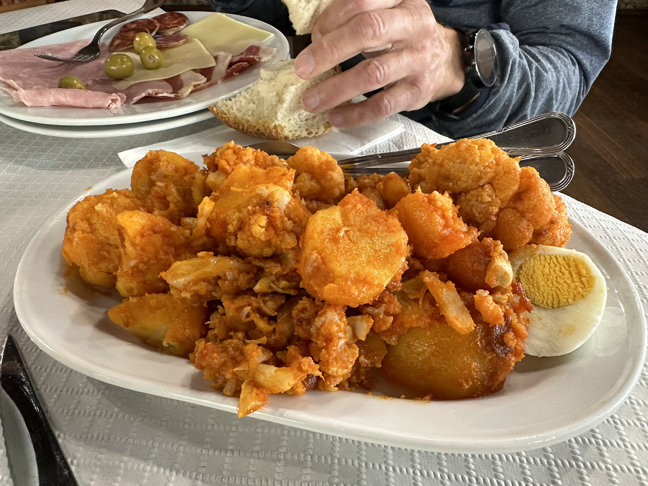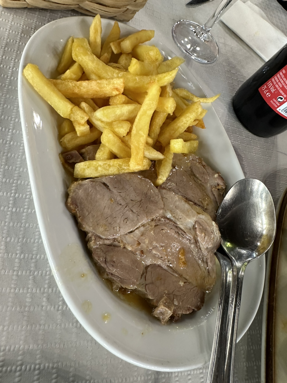 오늘은 중간에 아무것도 못 먹어서 정말 배고팠다. 바로 메뉴 델 디아 먹으러 갔다. 호기심에 콜리플라워 감자 지짐을 시켰는데 정말 맛이 없었다. 피터의 수프를 뺐어먹었다. 그래도 항상 돼지고기 구이를 두 번째 접시로 시키는데 기름지지만 에너지를 채워주는 기분이다. 같이 나오는 감자튀김을 피터가 뺐어먹었다.