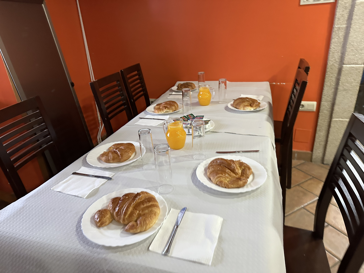 보통 아침식사를 거하게 먹으면 길에서 화장실 가고 싶어진다. 그래서 최근엔 거한 아침식사는 잘 안 챙겨먹고 따뜻한 카페라테만 한 잔 마셨다. 이젠 2일 남았고 화장실도 있으니 편하게 초코빵에 카페라테에 오렌지주스 세트를 5유로에 즐겼다. 열심히 걷고 먹으니 더 맛있더라.