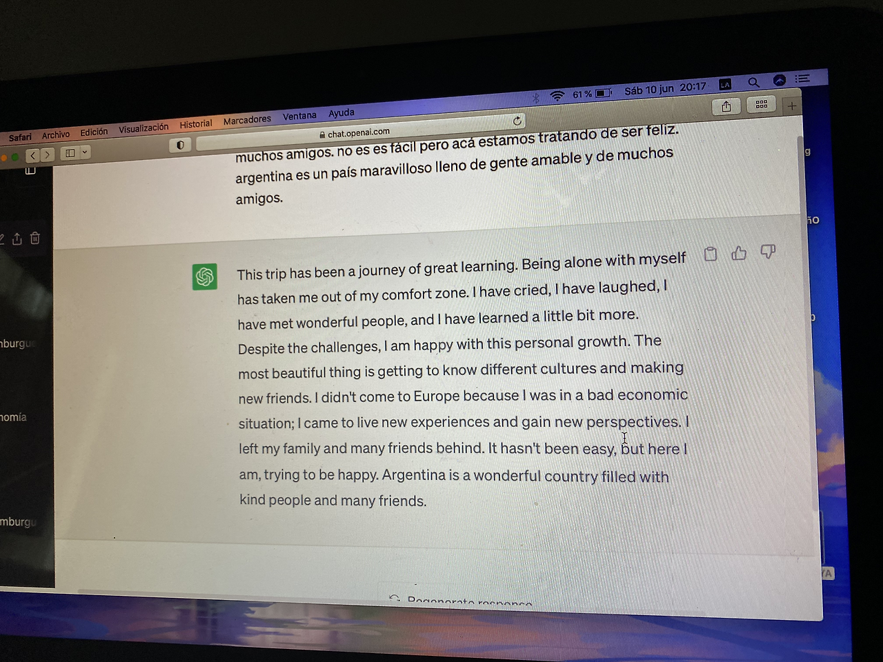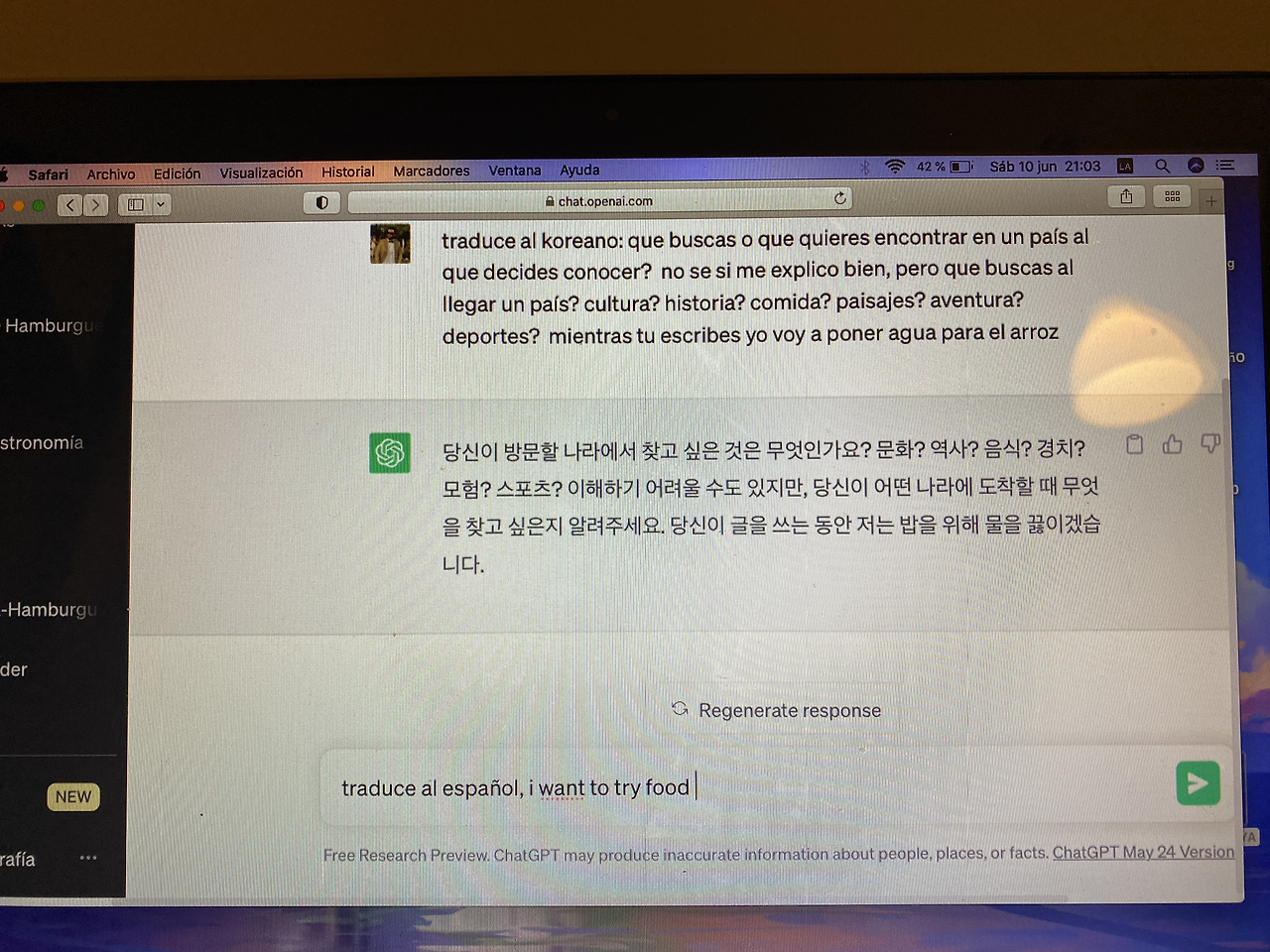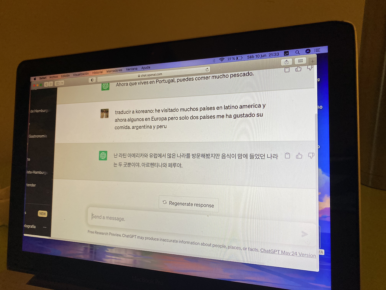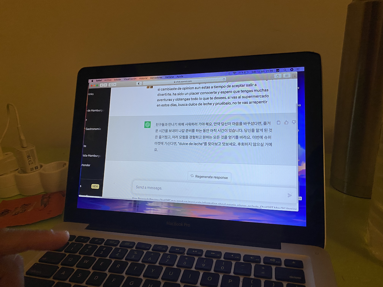 혼자 여행 다니는 것의 어려움을 이해한다며 아르헨티나 경제상황이 안 좋아서 포르투갈로 3일 전 이사 왔다고 말했다. 그래서 같이 밤 11시에 술 마시러 가자고 제안한 것이다. 나는 스페인어를 못하고 환은 영어를 못하지만 챗 GPT 덕분에 소통에 문제가 없었다.
