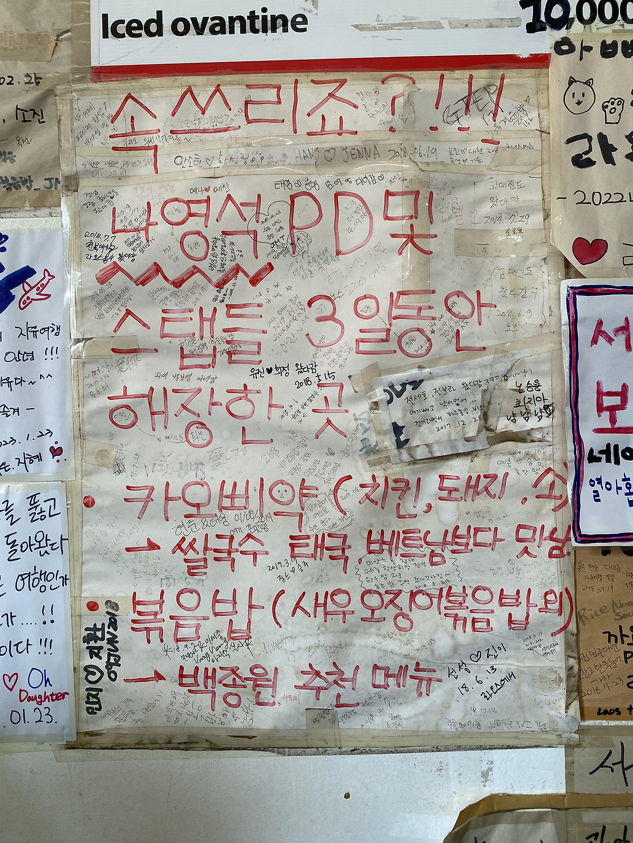 깐깐한 한국인들이 추천한 집이요? 못 참죠! 저도 가봐야죠! 벽마다 한국인들이 남겨둔 추천으로 빽빽하다. 미리 적힌 추천 메뉴대로 똑같이 손민수 해서 주문하면 된다. 이미 많은 한국인 관광객이 보증하는 코스가 있다. 실패할 확률이 적은 것이 라오스 방비엥 여행은 가장 큰 장점이 아닐까.