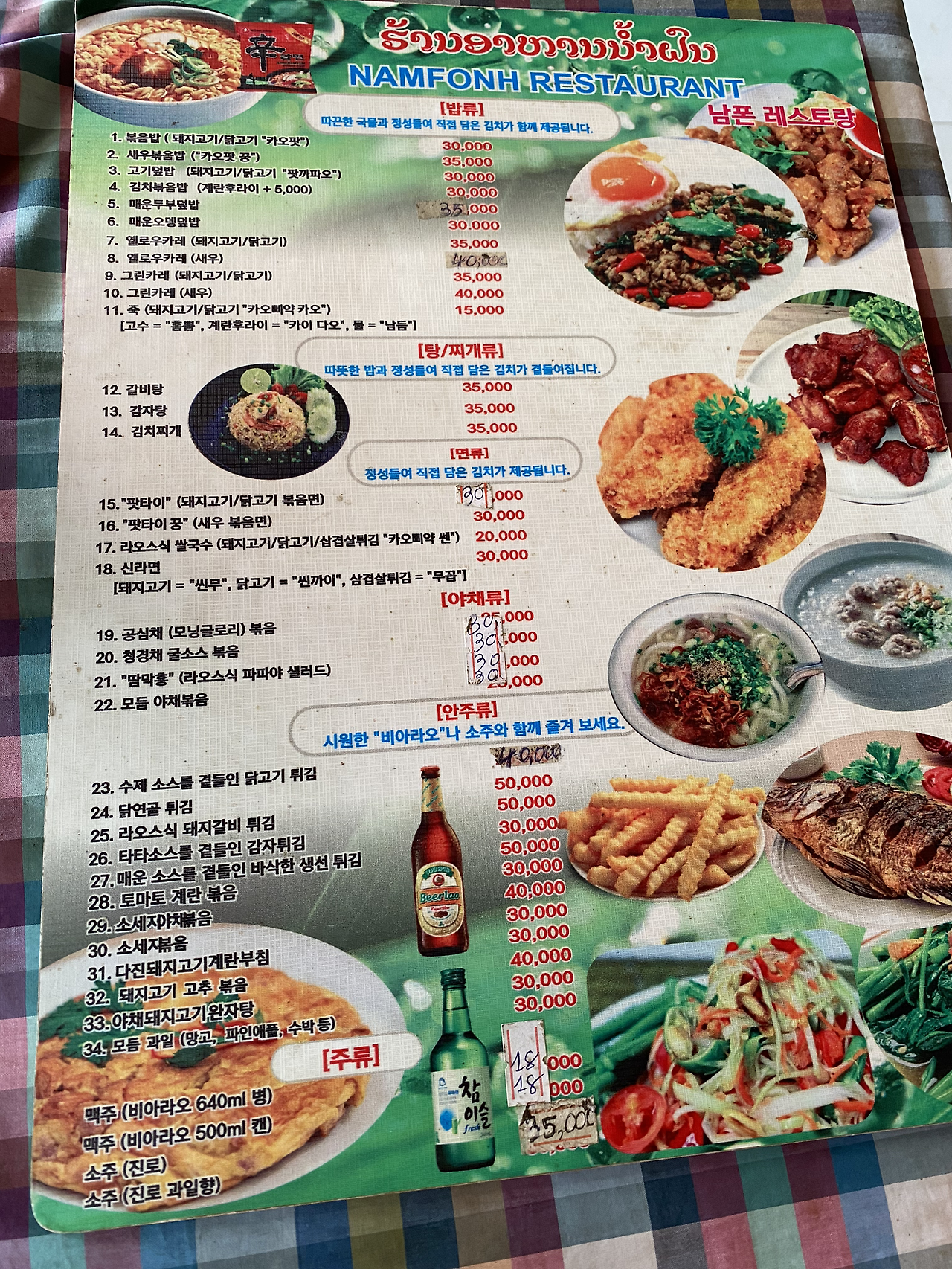 메뉴판이 다 한국어로 되어있어서 감동했다. 역시 잘 모를 때는 유경험자의 추천을 따라가면 된다. 14번을 가리켰더니, 사장님께서 "김치찌개?"로 답해주신다. 독일 1년 살았지만 7년이 지닌 지금, 이제 식당에서 독일어가 들려도 거의 무슨 말을 하는지 모르겠는 나다. 라오스인 사장님은 저렇게 바로 이해하고 반응하시기까지 얼마나 노력하신 걸까. 덕분에 라오스에서 한국의 맛을 느꼈다. 다만 돼지고기 한 움큼 넣고 콩나물, 두부까지 아낌없이 들어간 내가 요리한 김치찌개 먹고 싶어졌다. 인간은 욕심은 역시 끝이 없나 봐요.
