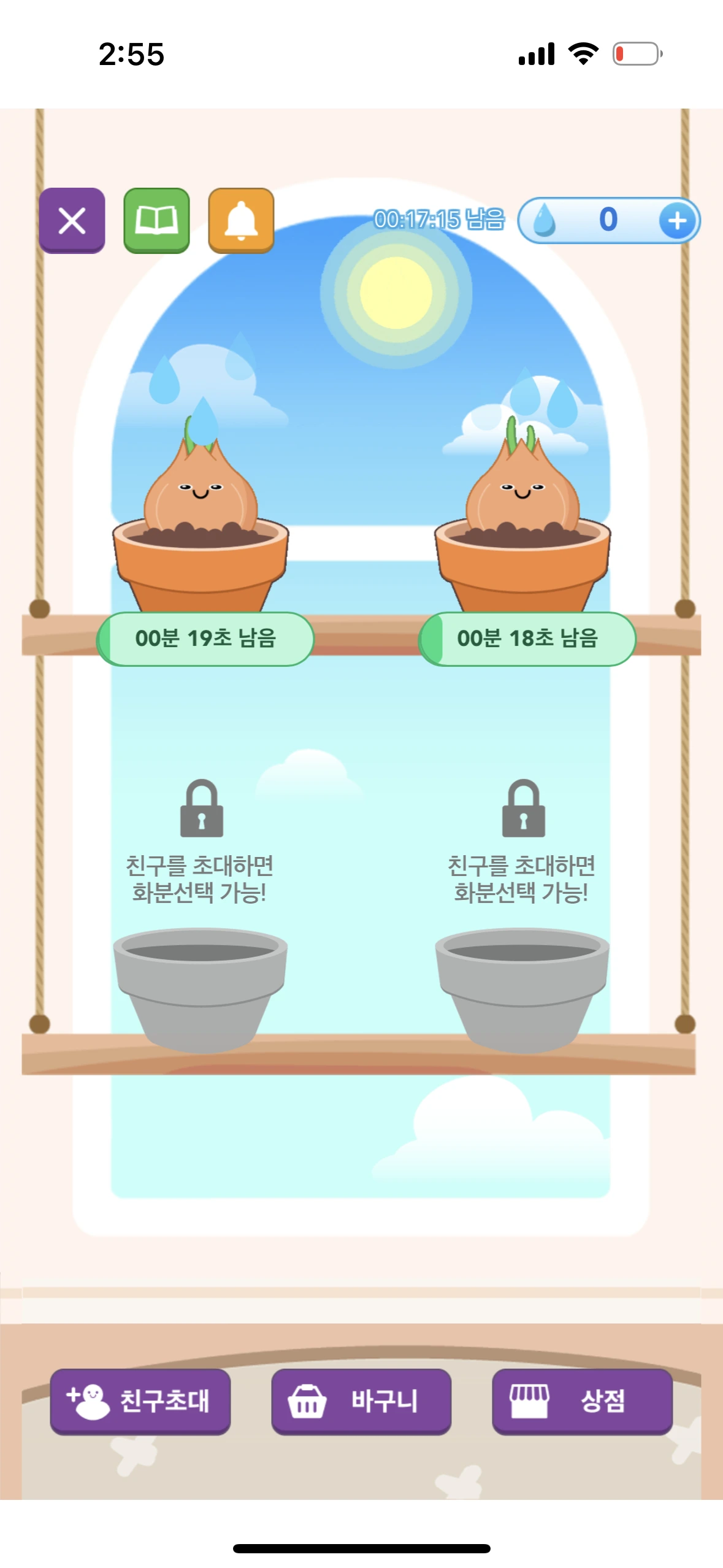 마이컬리팜에서는 물의 개수가 한정적이라, 물을 다 쓰면 30분을 기다려서 1개가 생성될 때까지 기다려야 한다. 그런 면에서 우리나라 물부족국가가 맞다. 물 1개를 위해 30분을 기다리는 것도 아름답다. 실제 농사도 분명 기다림의 시간이 필요하니까. 하지만 온라인에서는 친구찬스로 극복가능하다. 친구가 마이컬리팜을 새로 시작해서 수확물 10개를 키우면 화분 1개와 물 6개를 받을 수 있기 때문이다. 온라인 농사중독자가 또 다른 온라인 농사중독자를 만들어내는 아름다운 구조인 것.