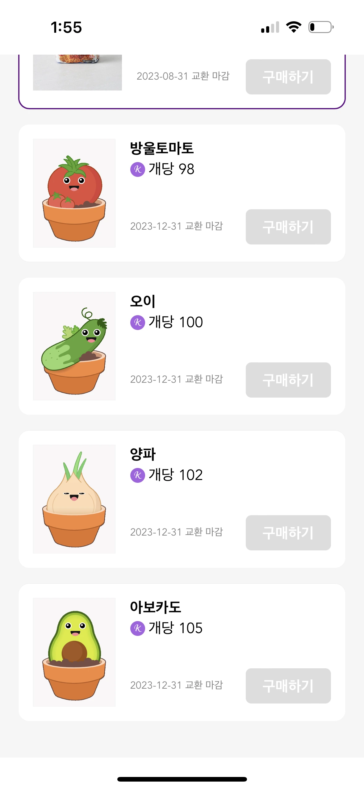 처음엔 다양하게 키우다 보니 수확해 놓은 오이와 아보카도가 아깝더라. 왜냐면 귀한 물을 3번이나 부어 만든 작물이기 때문이다. 이런 아쉬움을 달래줄 패자부활전이 존재한다. 바로 사고팔기 기능이다. 내가 재배한 작물을 팔고 포인트를 얻어 다른 작물을 구매할 수 있다. 방울토마토, 오이, 양파, 아보카도가 싫은 사람들을 위해서 작물로 얻은 포인트를 생수나 비빔면으로 구매할 수 있도록 해놨다.