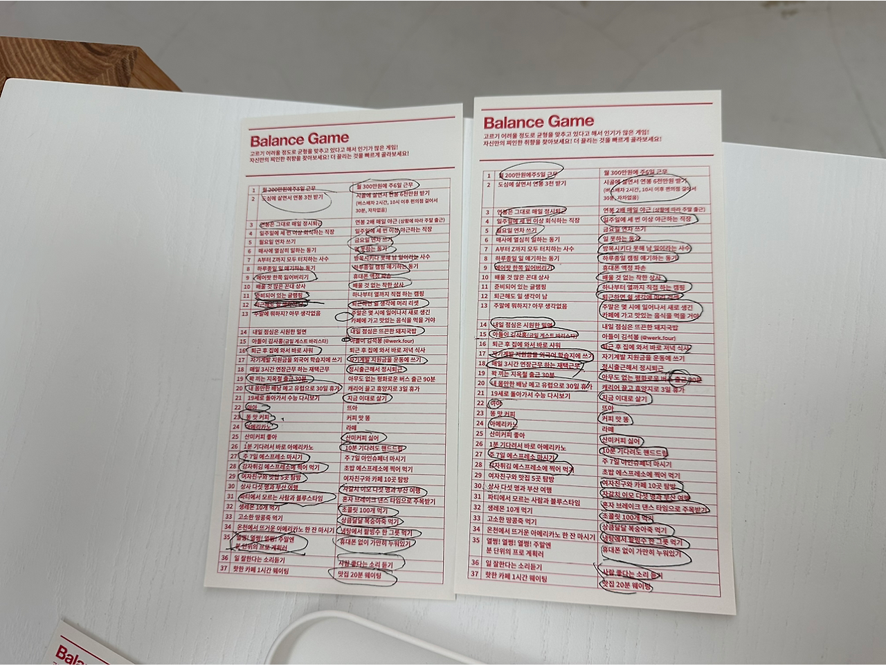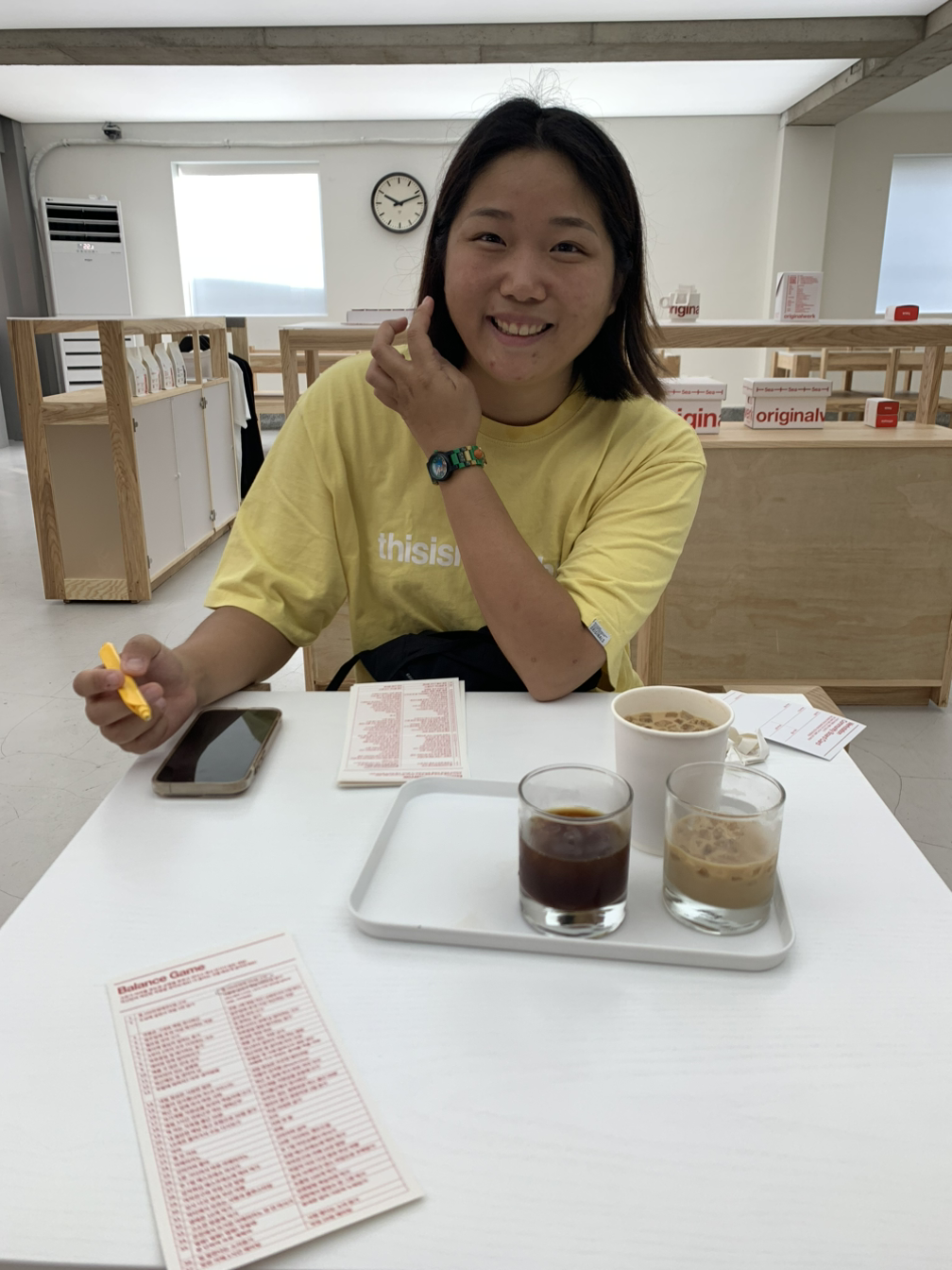 평일 오전이라 손님이 우리 포함 딱 3명뿐이었다. 2층 매장에 자리가 많아서 편하게 앉을 수 있었다. 1층에서 2층으로 올라가는 계단에 밸런스게임 종이가 있어서 챙겼는데, 이게 신의 한 수였다. 일에 대한 다양한 질문이라 여행작가 프리랜서를 준비하는 나와 디지털노마드로 여행하는 레미의 취향차이와 선호하는 가치관을 알 수 있었다. 친한 친구와 또는 친하게 지내고 싶은 친구와 같이 일에 관한 밸런스 게임을 해보길 추천한다. 커피도 물론 훌륭했다. (원두가 다양했는데, 산미를 싫어하는 내가 고른 원두는 baby였다.)