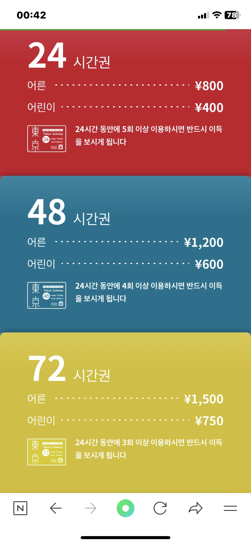 무리해서 하루에 3만 보 이상씩 걸었더니 점점 지치더라. 가장 저렴하게 구매하기 위해 72시간 패스를 끊고 싶었다. 엔저현상으로 우리나라보다 물가가 싸다고 하지만 교통비는 비슷하거나 일본이 더 비싸다.