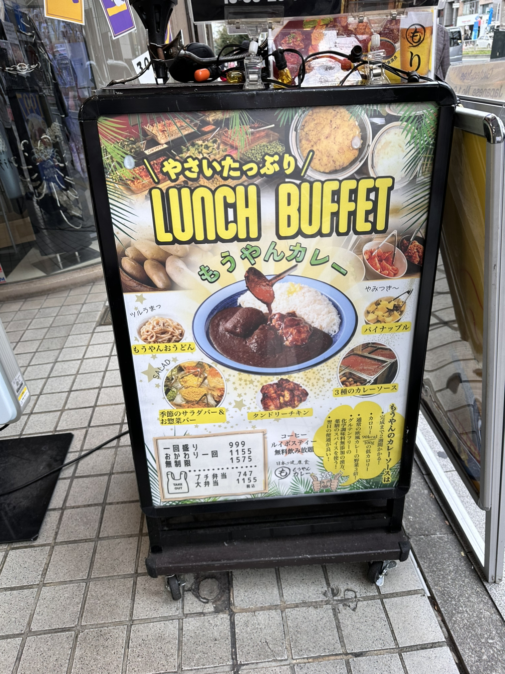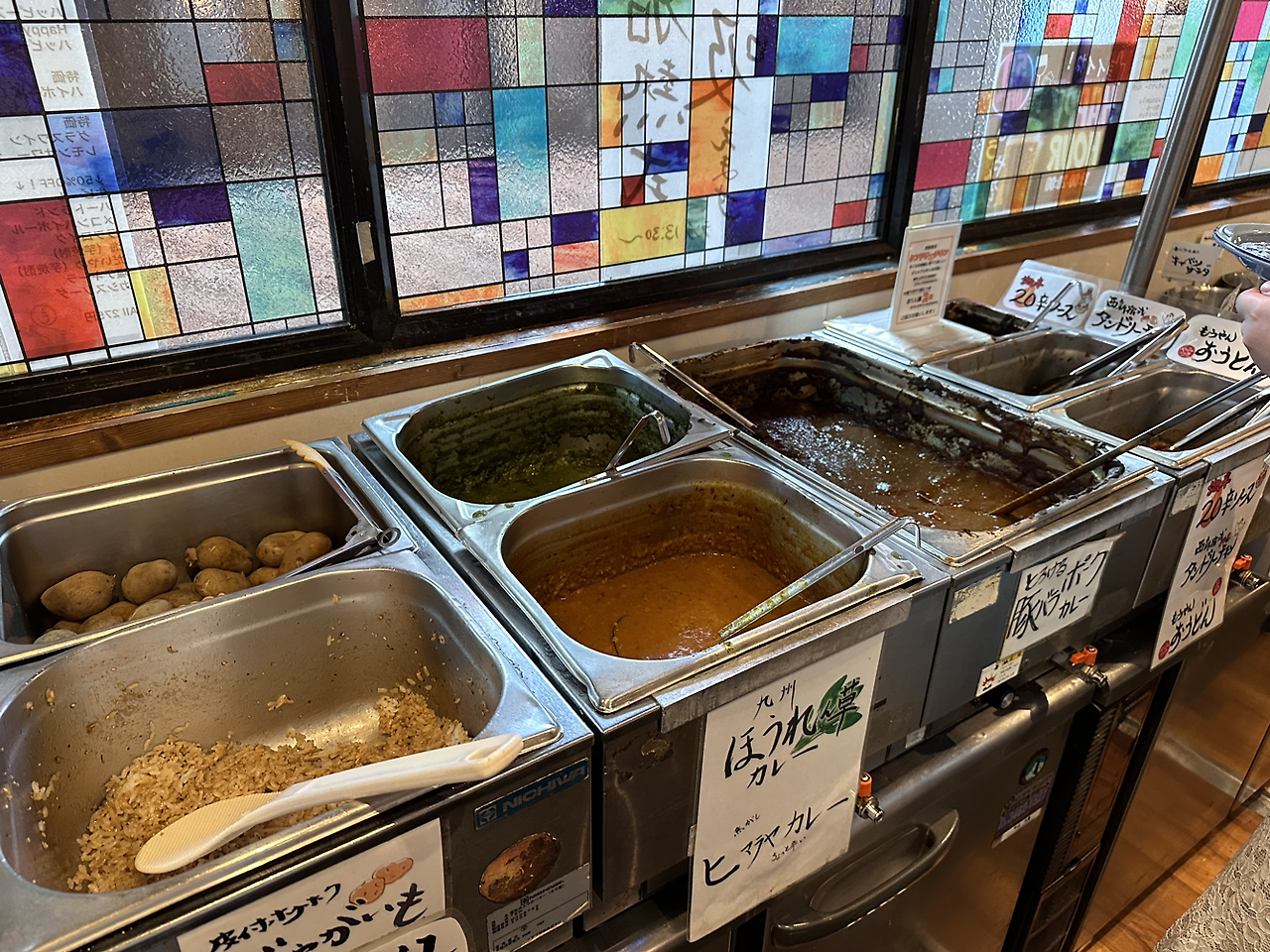 점심엔 카레 3가지 종류와 닭고기 토핑, 갖가지 반찬을 구성으로 카레뷔페를 운영하는 게 아닌가. 한 그릇은 999엔, 두 그릇은 1,155엔이었다. 배고픔에 굶주린 상태에서 156엔의 차이밖에 안 난다고 하니 당연히 두 그릇을 선택했다. 뷔페 이용시간이 30분밖에 남지 않았음을 알고도 폭주한 것이다.