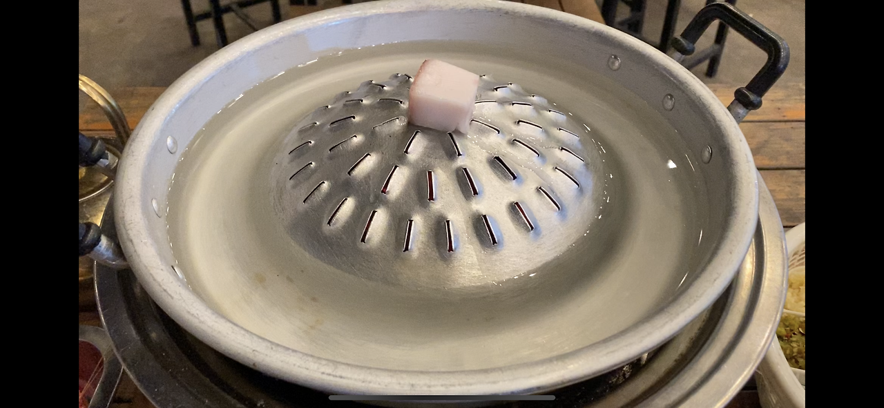 숯불 위에 냄비도 아닌 프라이팬도 아닌 고기불판 냄비가 올려져서 나온다. 이 냄비는 가운데는 구멍이 숭숭 뚫린 고기 불판으로 되어있고, 테두리는 육수를 부을 수 있게 홈이 파여있다. 불판이 눌어붙지 않도록, 돼지기름을 내어 꼼꼼히 둘러주는 걸로 식사를 시작한다.