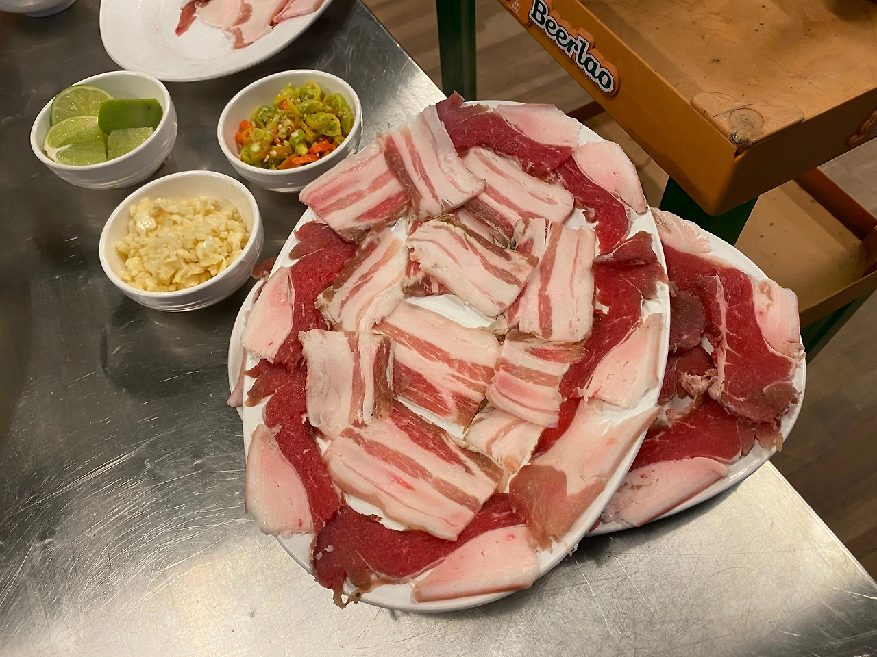 라오스에선 고기를 구울지, 샤부샤부로 고기를 담글지 고민하지 않아도 된다. 신닷은 이 2가지가 한 번에 가능하다. 고기가 일반적인 삼겹살보다는 대패 삼겹살에 가까운 두께로, 금방 익을 수 있게 준비되기 때문이다. 이러한 이유로 현지인들이 가장 선호하는 외식 메뉴 중 하나라고 한다.