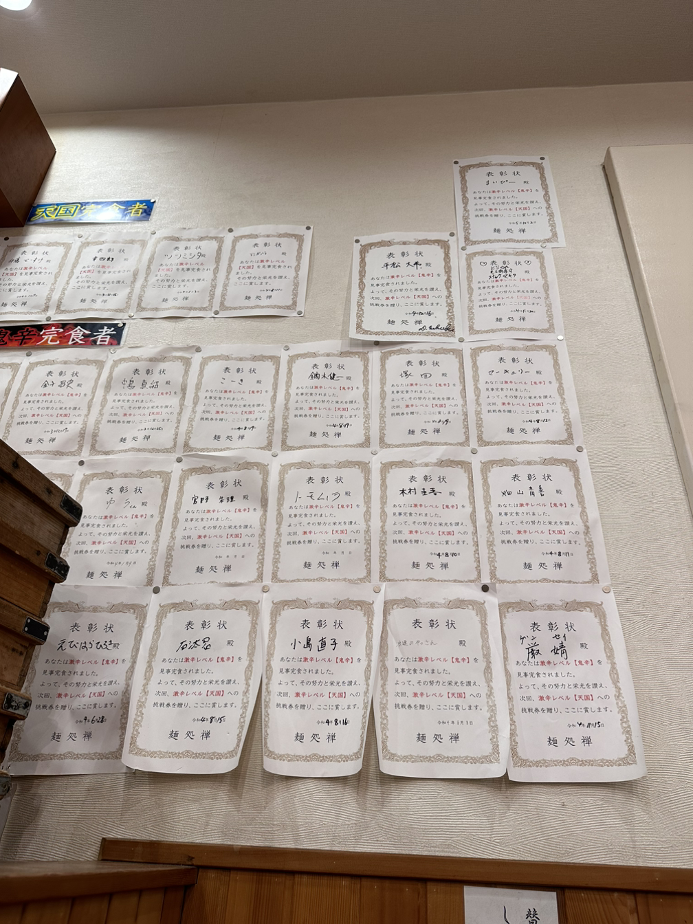 구경이 망했을 땐 맛있는 음식으로 풀어야 한다. 근처에 라멘집이 있어서 향했다. 벽 한편이 상장으로 도배되어 있더라. 자세히 살펴보니 매운맛라멘 명예의 전당이었다.