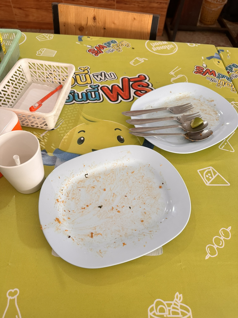 볶음밥을 깔끔히 비우고 볶음면에 뛰어들었다. 한 접시를 너무 깔끔히 먹었는지 식당이모가 내게 다가오신다. 음식 두 개를 다 먹냐고 손으로 브이를 그리시며 웃으셨다. 고개를 끄덕이니 따봉을 하시며 활짝 미소를 지으시더라. 태국어를 몰라도 소통이 되는 게 신기하지 않나.