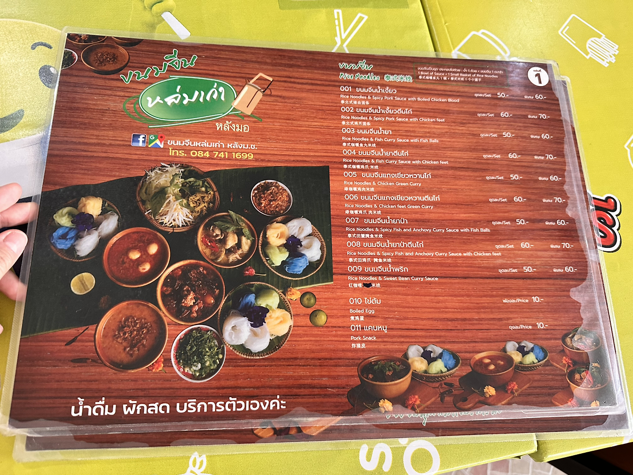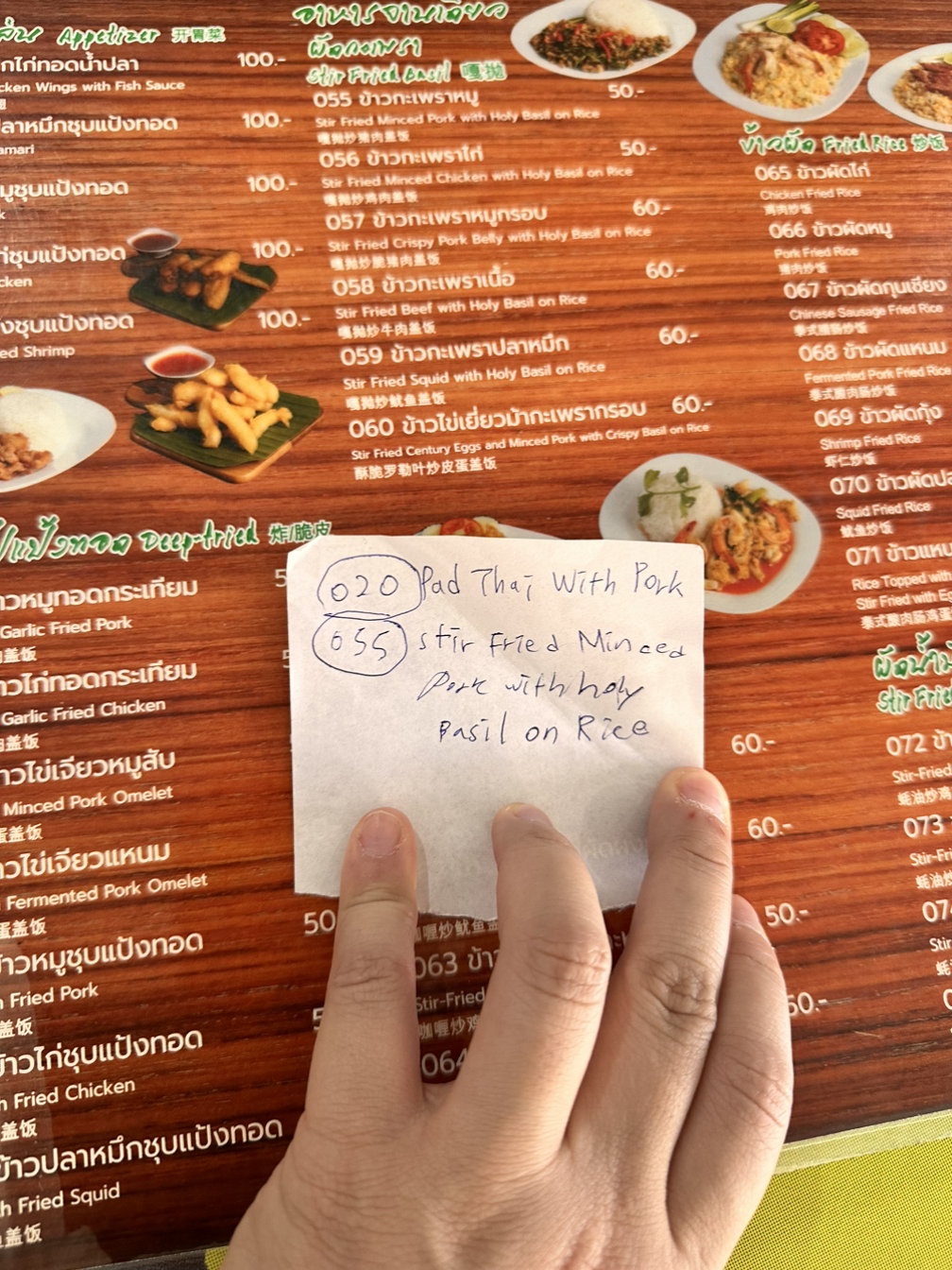 원래는 치앙마이 대학교 학식을 먹으려 했으나 자전거바퀴를 굴릴 힘이 없더라. 집 근처 식당을 찾았다. 이 식당은 메뉴가 50가지가 넘는다. 다행히 영어메뉴판이 있어서 메뉴 선택에 지장이 없다. 배가 고팠던 나머지, 음식을 두 접시나 주문했다. 그것도 매우 무거운 걸로. 주문할 메뉴를 종이에 써서 식당이모에게 넘겨드렸더니 약간의 미소를 띄우셨다.