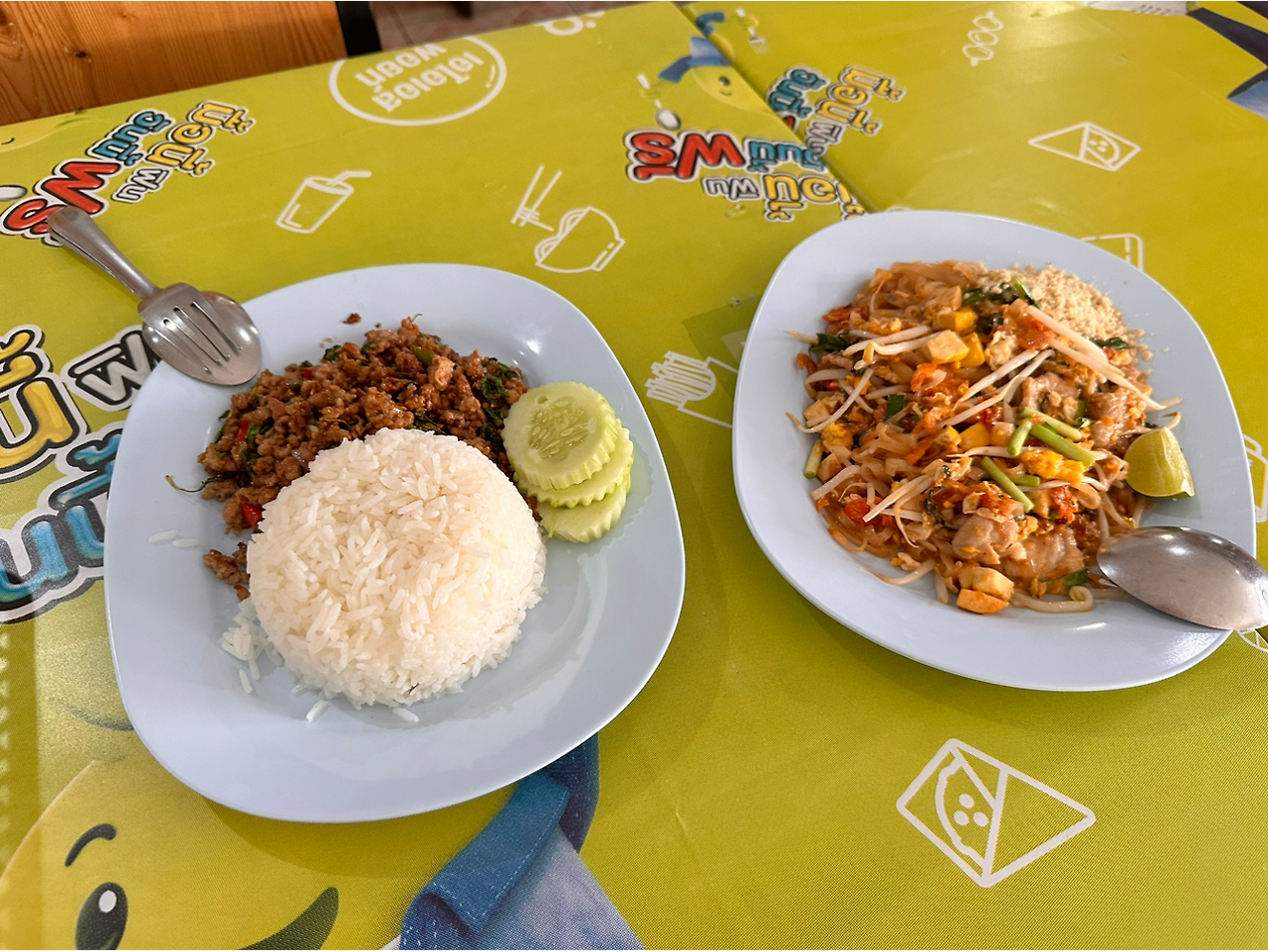 얼마 있다가 음식 두 접시가 나란히 나왔다. 이모가 활짝 웃으며 가져다주셨다. 딱 봐도 양이 엄청났다. 두 봉우리의 밥과 면을 마주했으니. 안 먹어도 이미 비주얼에 배가 불렀달까. 내가 시킨 메뉴는 태국음식의 양대산맥인 팟타이 볶음면과 팟크라파오무쌉 바질볶음밥이었다.