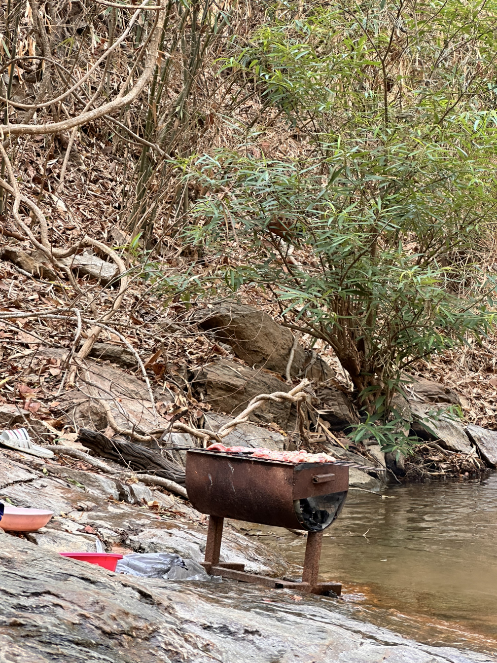 물놀이를 즐기는 태국인들 그리고 태국에서 일하는 미얀마인들을 구경했다. 미얀마 남자들은 타투가 많은 점. 젊은 아기엄마들이 많은 점. 가족구성원이 형제자매가 있는 대가족인 점. 그래서 트럭 뒤에 다 같이 오순도순 타고 이동하는 점. 캠핑의자와 테이블을 물가에 설치하고 맛있는 음식을 먹는 점. 숯덩이가 담긴 화로를 가져와 물가 앞에서 바비큐를 열심히 굽는 점. 재밌고 즐거운 일 투성이었다.