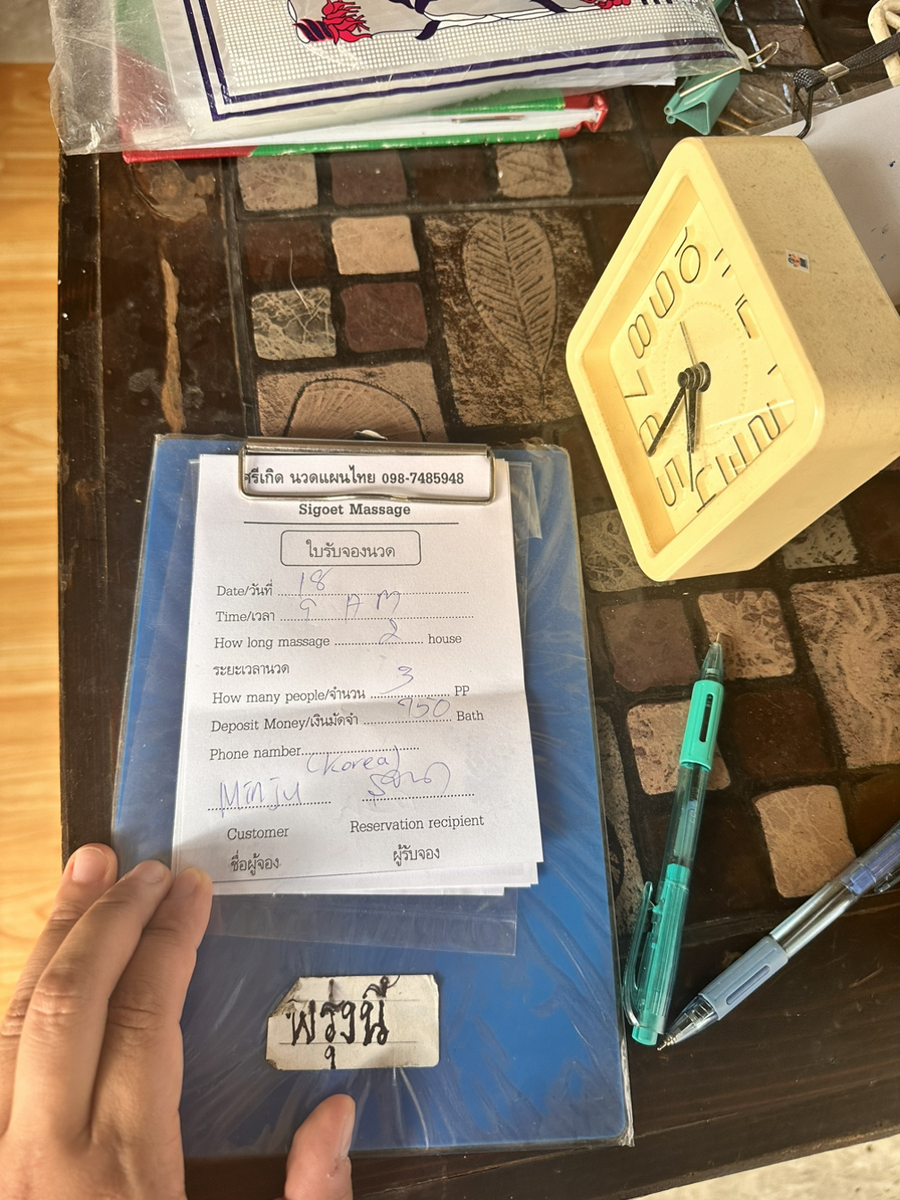 어제 무작정 찾아갔을 때, 한 마사지사가 손으로 엑스를 만들어 풀부킹임을 안내해 줄 정도였으니. 그리곤 손가락으로 여보세요 전화기를 만들어 전화예약하라고 알려주었다. 투명한 유리창문 사이로 언어장벽 없이 손으로 소통이 원활한 게 귀여운 포인트.