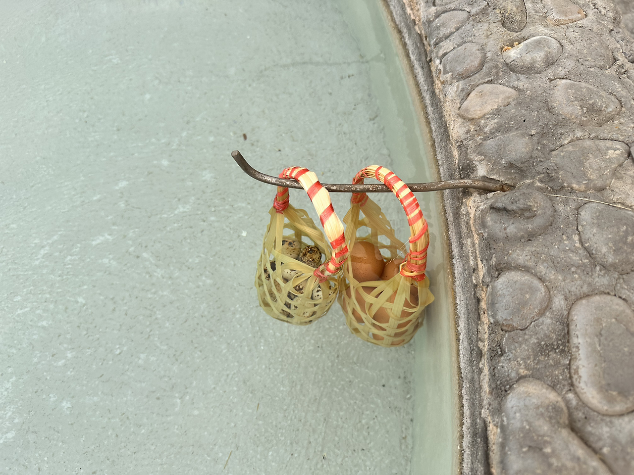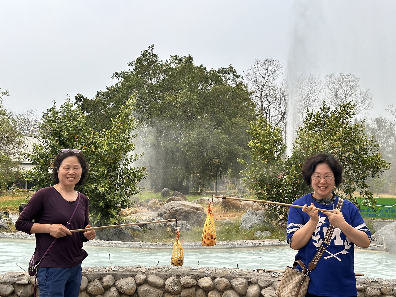 계획대로 입장료 100밧(4,000원)씩 내고, 온천에 들어갔다. 계란 한 바구니, 메추리알 한 바구니 100밧에 사서 55도 이상으로 팔팔 끓는 온천물에 풍덩 담갔다. 20분 동안 온천물이 샘솟는 원천 앞에서 인증사진을 찍으며 놀았다.