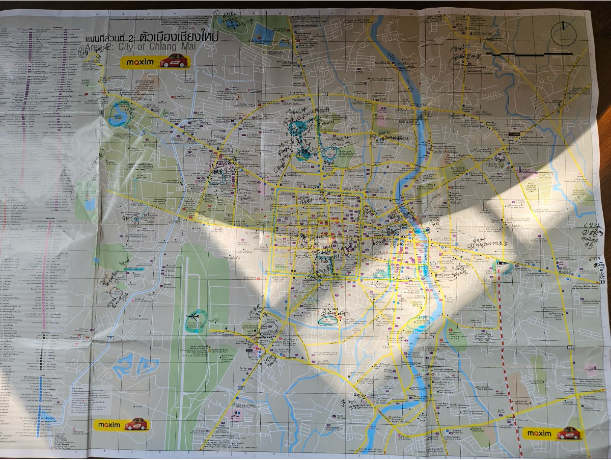 급기야는 아날로그 치앙마이 지도를 크게 펼쳐서 이번 여행에서 다닌 경로를 1일 차부터 쭉 표시했다. 여긴 오일마사지받던 동네, 저긴 정글카페 있던 동네. 치앙마이 전체가 우리 동네가 되는 중이다. 치앙마이의 거리 골목골목을 거닐며 함께 보았던 풍경을 시간이 지나도 함께 나눌 엄마가 있어서 좋다.