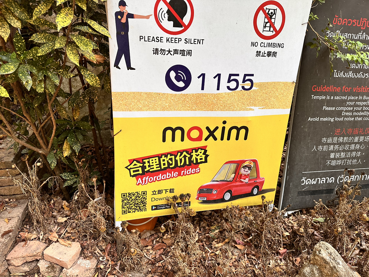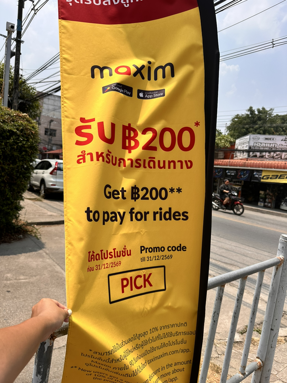 치앙마이에서 식당과 시장, 마사지샵 등을 비롯한 시내 곳곳의 현수막부터 파라솔, 운전자의 차량, 운전자의 유니폼, 공항 내 지도 책자까지 노란색 배경에 빨간 글씨 막심을 홍보한다. 거의 도배를 했다고 말해도 무방할 정도다.오프라인에서 할 수 있는 최선을 다해 자신을 알리고 있었다.