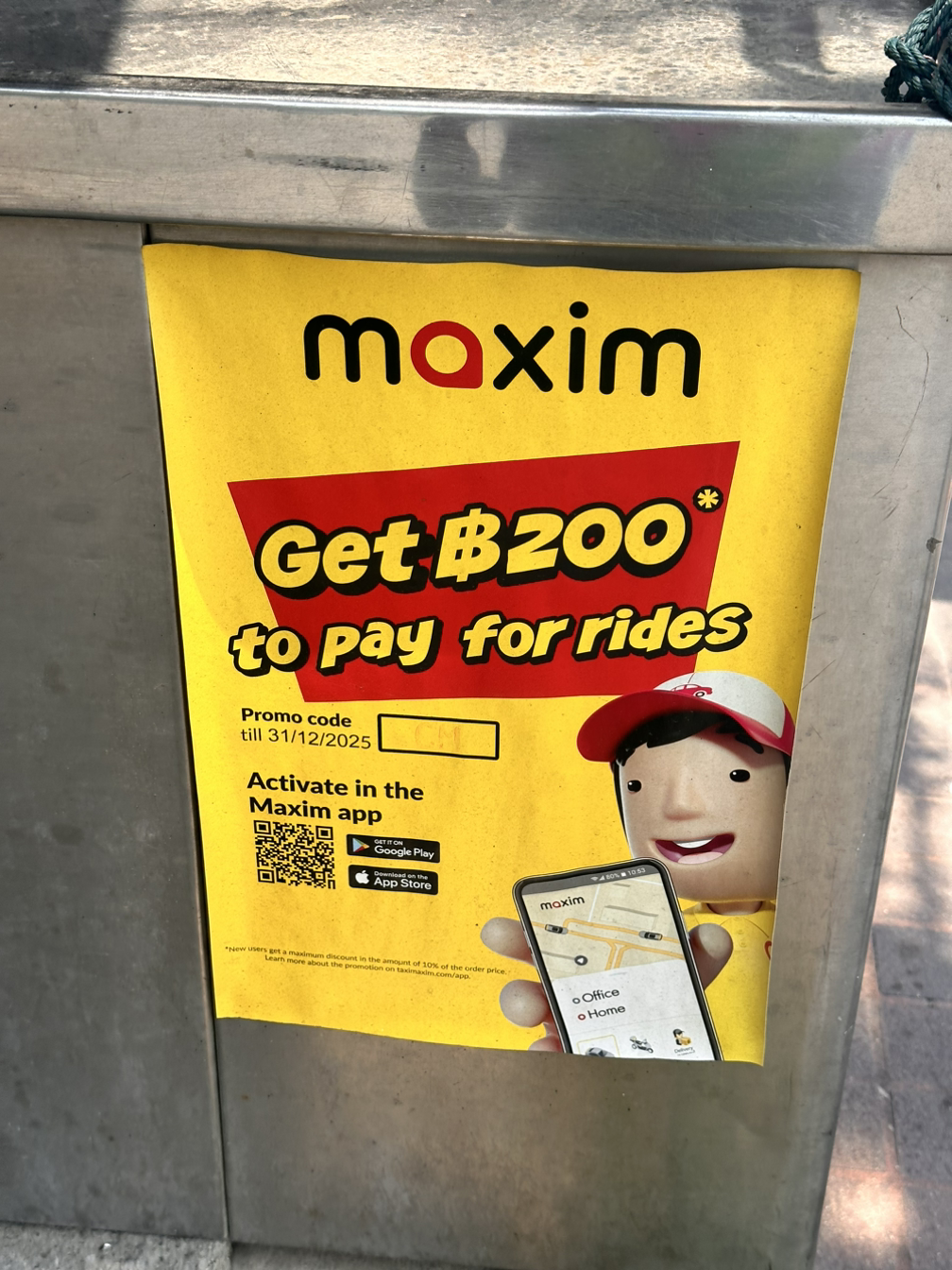 프로모션 코드의 바트를 다 소진할 때까지 현금으로 택시비를 지불하며, 필요하다면 기사들에게 할인된 사실을 적극 소명하면서도 Maxim을 이용할 것이다. 다양한 불편함을 느끼면서도 계속 이 어플을 사용하는 것이 회사의 의도대로 난 막심에 스며든 것이 아닐까. 할인과 자꾸만 눈에 띄기는 강력한 마케팅임을 부정할 수 없다.