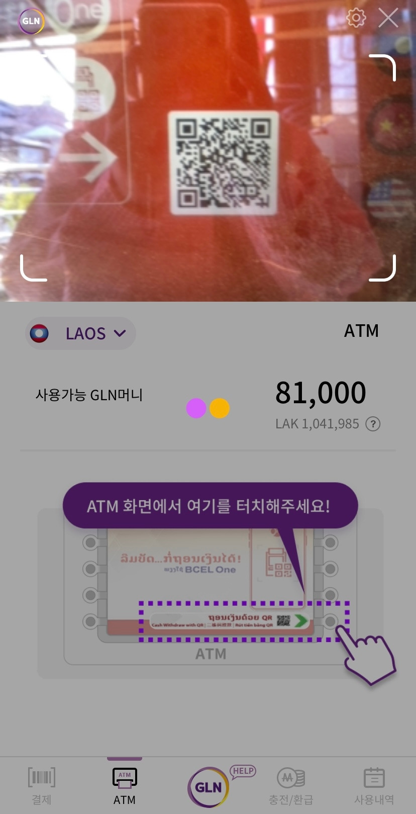 처음으로 하나은행 GLN페이를 사용해봤다. 이 서비스의 가장 큰 장점은 카드가 필요 없는 것이다. 그저 앱에서 ATM기의 QR코드 스캔만 하면 현금 출금이 바로 가능하다. 출금할 금액을 입력하면 실시간 환율에 따라 계산된다.