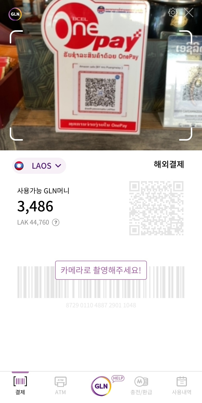 굳이 달러로 환전한 후 두껍게 들고 와서 다시 라오스 낍으로 환전하지 않아도 되는 세상이 된 것이다. 출금은 최소 5만 낍(4,000원)부터 가능하다. 신나서 방비엥 시내 프랜차이즈인 카페 아마존에서 QR결제도 시도해 보았다. 아쉽게도 GLN에서 지원하지 않는 가맹점이 아니란다.