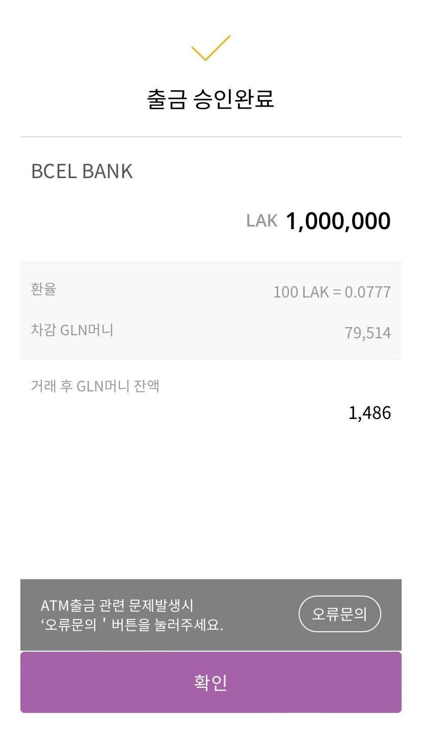 앱에서 확인되는 보안번호 6자리를 다시 ATM에 입력하면 바로 돈이 나온다. 오늘 기준 100만 낍을 출금했고, 79,514원이 빠져나갔다. 인터넷과 인출금액 차이를 확인하니 3천 원 정도다. 보통 한국 돈에 0.08을 곱하면 라오스 낍 계산이 쉽다.