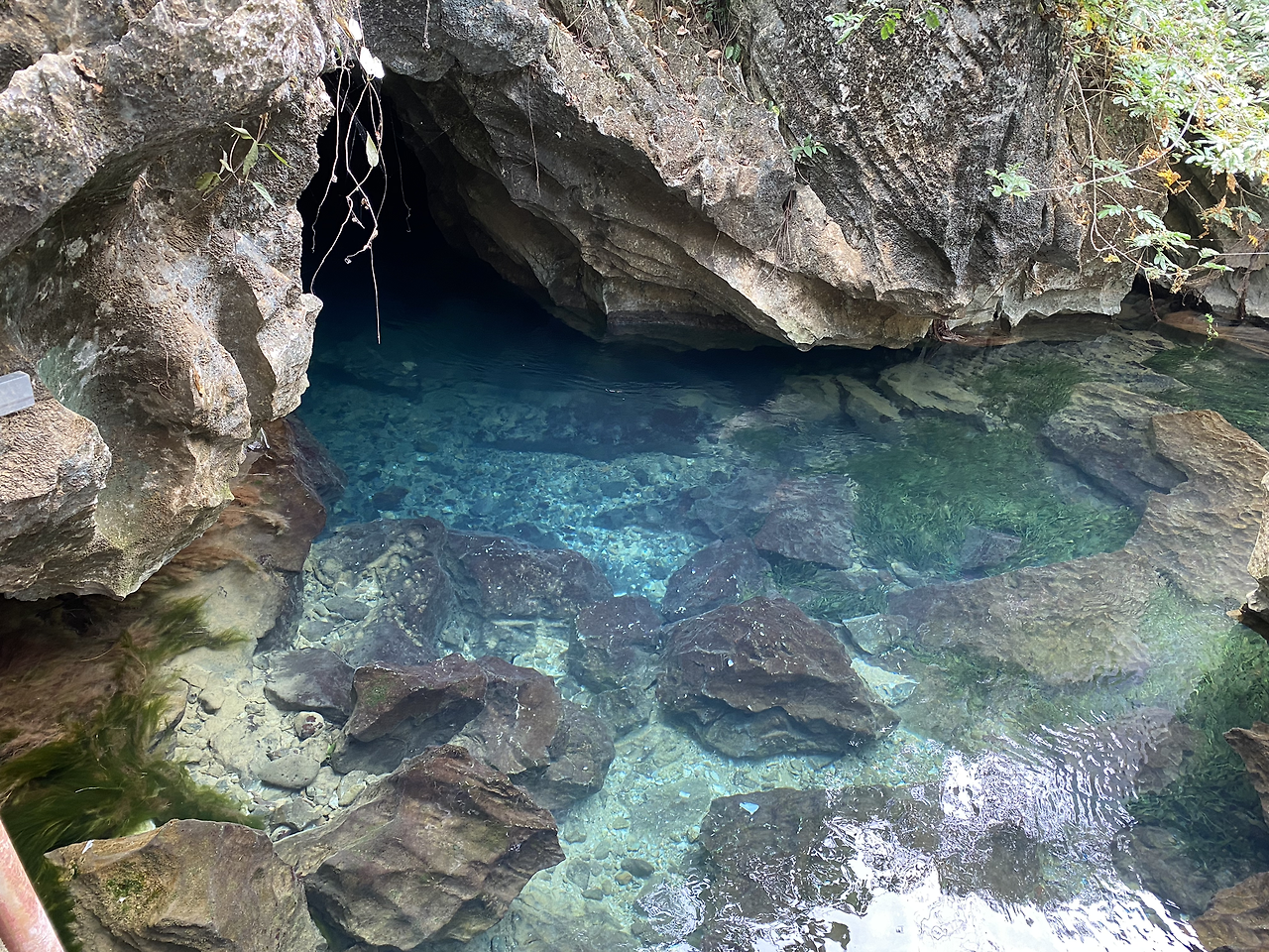 들어갔던 입구로 다시 나오면 된다. 올라왔던 계단을 내려간다. 사실 탐짱 동굴을 온 진짜 이유는 따로 있다. 바로 이 탐짱 동굴의 입구 왼쪽 편에 있는 샘이다. 물이 엄청 파랗다. 어서 발을 담궈본다.