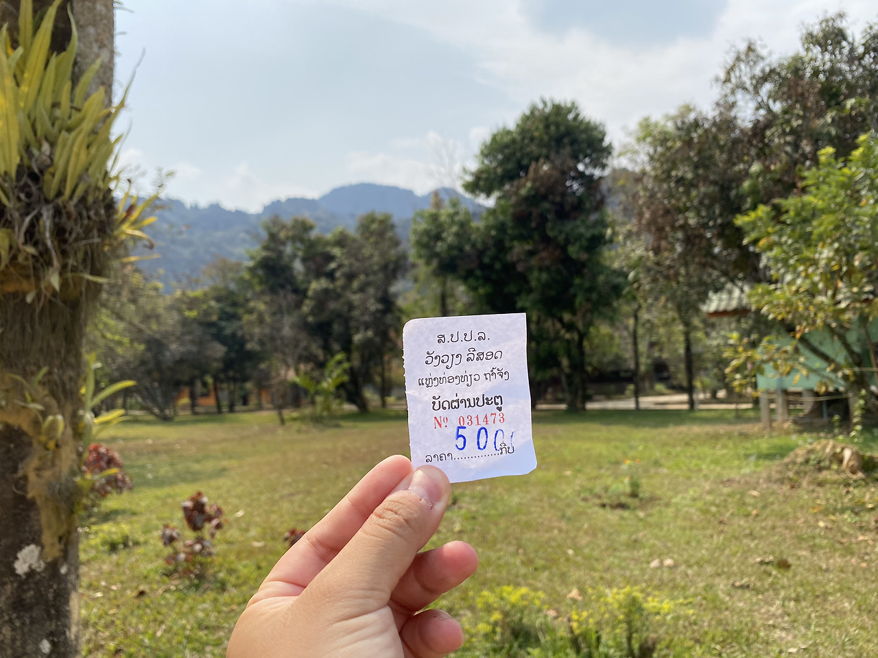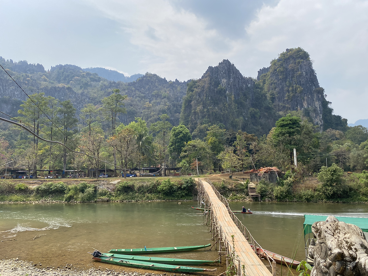 준비물도 다 챙겼겠다. 구글맵에 탐짱동굴을 목적지로 찍는다. 읍내에서 슬렁슬렁 15분 쯤 걸었을까? 매표소가 나온다. 강을 건널 수 있는 다리 왕복통행료를 사야한다. 400원이지만, 다리 하나 건너려고 돈을 낸 적은 처음이라 낯설다. 사람만 건널 수 있는 나무다리다. 차, 자전거, 오토바이는 건널 수 없어 주차해야한다.