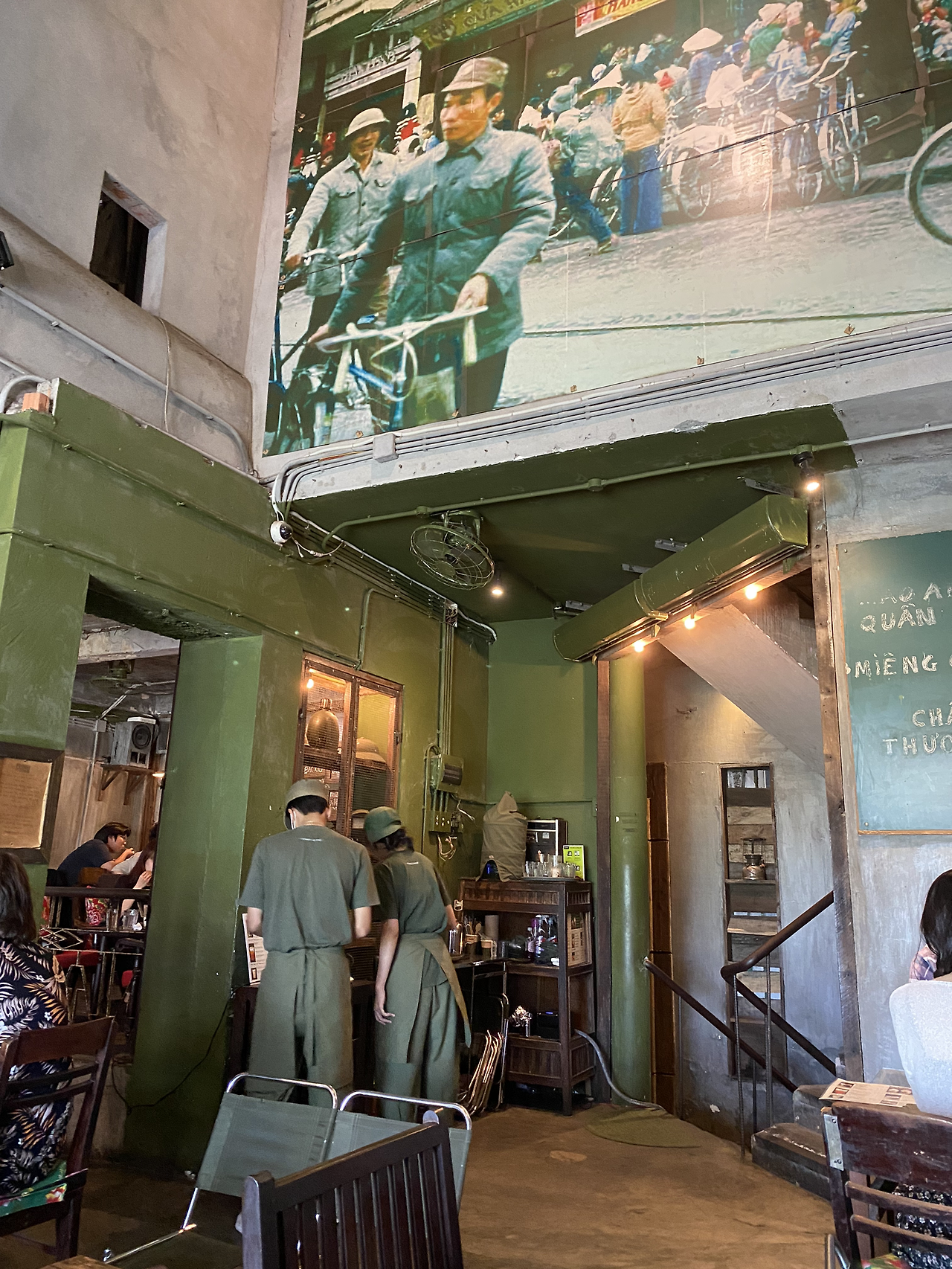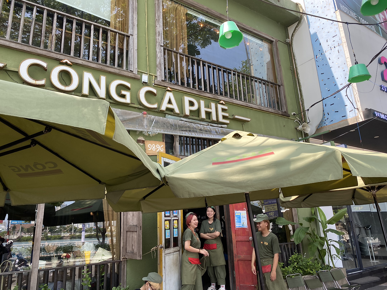 실제로 다낭 콩카페 1호점에 방문해 보니, 옛날 시대에 대한 향수가 듬뿍 느껴졌다. 거기다 직원들이 국방색 카키옷을 위아래로 맞춰 입고 손님을 맞이했다. 오래된 느낌이 나는 공간에 비해 상반되게 젊은 직원들이 같은 유니폼을 입고 미소로 반겨주는 모습이 인상적이었다. 베트남도 모르겠고, 공산주의는 더더욱 모르겠지만. 소품 하나하나에서 느껴지는 그 시대의 정취가 살아 숨 쉬고 있었다. 마치 베트남 옛날시절에 접속한 기분이었다.