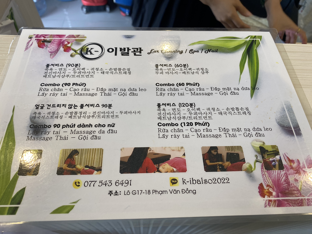 라오스에서 귀청소한 이야기를 꺼냈더니, 언니도 호응해 주었다. 자주 보는 유투버가 귀청소하는 영상을 재밌게 봤다고 한다. 청소는 들어간 노력 대비 결과값이 명확하다는 보람을 느끼지 않나. 그런 면에서 청소를 점점 즐기게 된다는 데 공감했다. 그래서 미용 풀케어는 베트남이 잘한다고 소문났는데 한번 해보자고 제안했다. 특히 귀청소는 인생에 한 번쯤 도전해 볼 만하다고 바람을 넣었더니 그녀도 호기심을 가졌다.