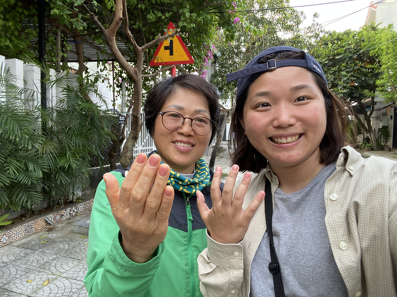 우리가 방문한 곳은 직원이 10명이 넘는 큰 규모의 네일스파숍이었다. 엄마 담당직원은 왼손 한 명, 오른손 한 명 두 명이 네일을 해줬다. 엄마랑 처음으로 네일을 똑같은 색깔로 나란히 칠했다. 깔끔하게 정돈된 손톱에 내심 기분이 좋았다. 네일 끝나고 요구르트랑 과자를 내어주는 극진한 대접을 받았다. 아쉬웠던 점은 네일 가격이 한국 가격이었다는 것이다. 한국인 사장님이 운영하는 곳이라 한국 가격을 받는 걸까. 다음엔 베트남 사장님이 운영하시는 네일숍에 가기로 엄마랑 합의했다.